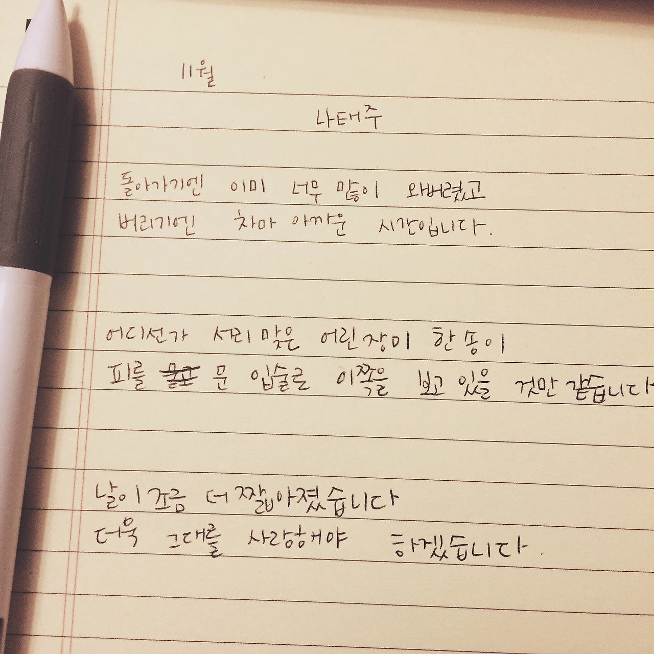 - 나태주 돌아가기엔 이미 너무 많이 와버렸고버리기에는 차마 아까운 시간입니다 어디선가 서리 맞은 어린 장미 한 송이피를 문 입술로 이쪽을 보고 있을 것만 같습니다 낮이 조금 더 짧아졌습니다더욱 그대를 사랑해야 하겠습니다