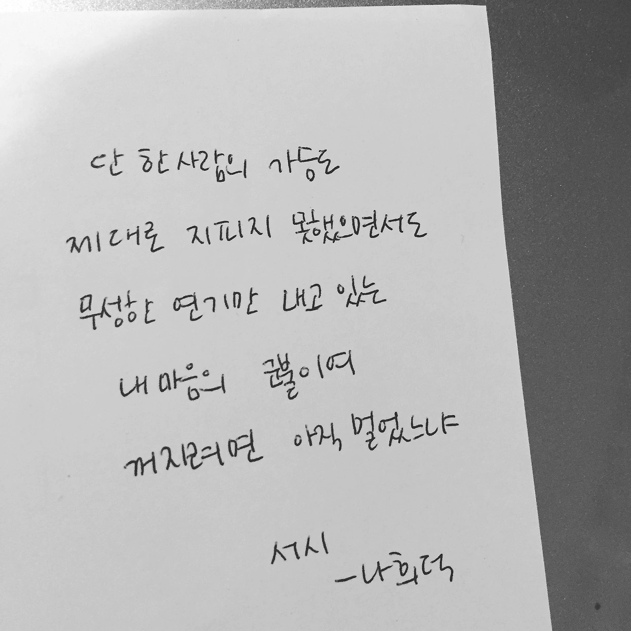 서시序詩- 나희덕단 한 사람의 가슴도제대로 지피지 못했으면서무성한 연기만 내고 있는내 마음의 군불이여꺼지려면 아직 멀었느냐