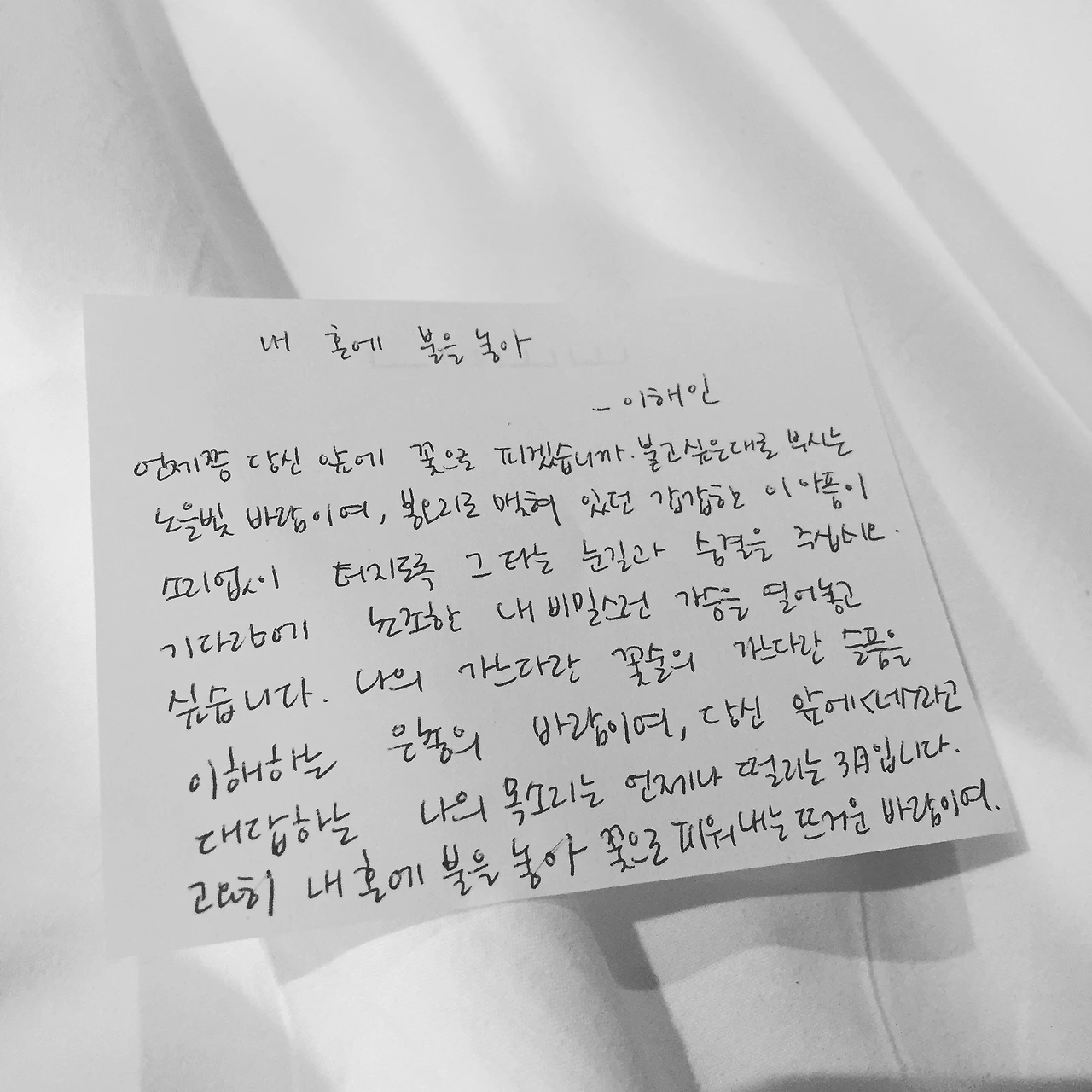 언제쯤 당신 앞에 꽃으로 피겠습니까. 불고 싶은대로 부시는 노을빛 바람이여, 봉오리로 맺혀 있던 갑갑한 이 아픔이 소리없이 터지도록 그 타는 눈길과 숨결을 주십시오. 기다림에 초조한 내 비밀스런 가슴을 열어놓고 싶습니다. 나의 가느다란 꽃술의 가느다란 슬픔을 이해하는 은총의 바람이여, 당신 앞에 <네>라고 대답하는 나의 목소리는 언제나 떨리는 3月입니다. 고요히 내 혼에 불을 놓아 꽃으로 피워내는 뜨거운 바람이여.