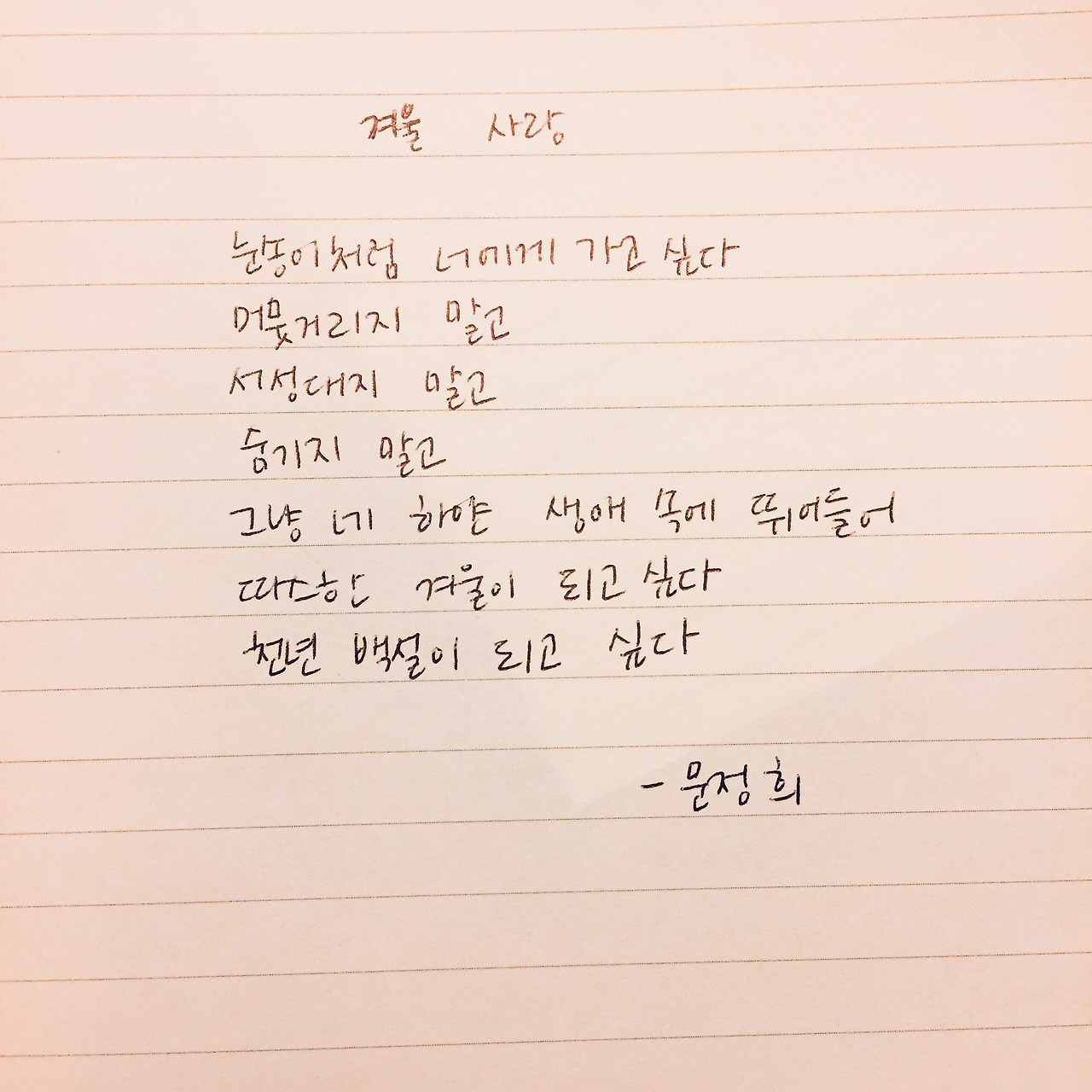 - 문정희눈송이처럼 너에게 가고 싶다머뭇거리지 말고서성대지 말고숨기지 말고그냥 네 하얀 생애 속에 뛰어들어따스한 겨울이 되고 싶다천년 백설이 되고 싶다