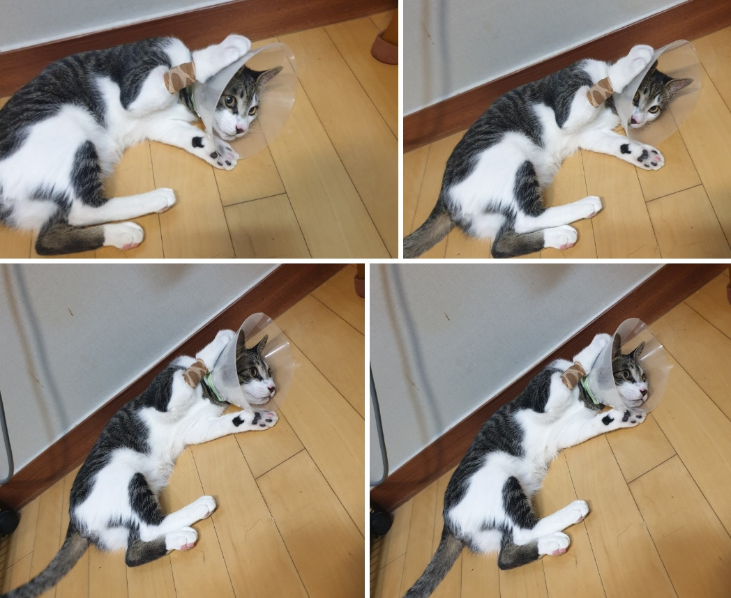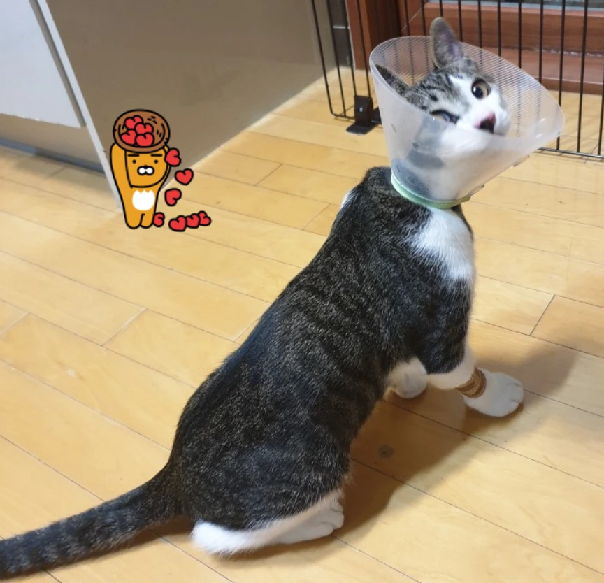 긴 하루를 마치고 드디어 집에 도착! 어찌나 발버둥을 쳤는지 링거 맞은 앞발이 퉁퉁 부어있었다. 녀석은 집에 왔다는 안도감에 신이 나 있다. 뒤늦게 넥카라의 불편함을 느꼈는지 벗으려고 안감힘을 쓴다. 화장실에 들렀다가 넥카라로 모래만 잔뜩 퍼 나르고 기우뚱기우뚱 균형도 제대로 잡지 못한 상태로 넘어진다. 하는 수 없이 넥카라를 바로 풀어 주었다. 구속에서 풀려난 녀석은 더 신이 나서 집 안 곳곳을 뛰어다닌다.