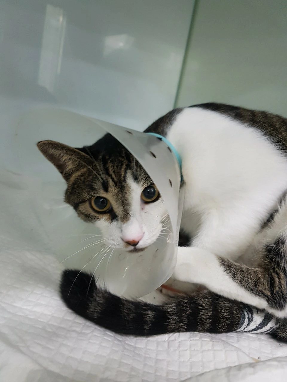 둘째 날 사진 속 오래는 성난 들고양이 모습이다. 집에서는 한 번도 본 적 없는 표정이다. 집에서 보여주었던 해맑고 순수한 표정은 온데간데없다. 우리가 자기를 병원에 버리고 갔다고 생각했을 것이고 몹시 불안했을 것이다. 목에는 넥카라, 몸에는 불편한 장비까지.