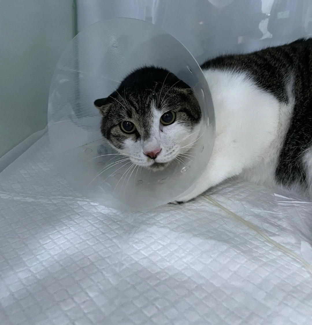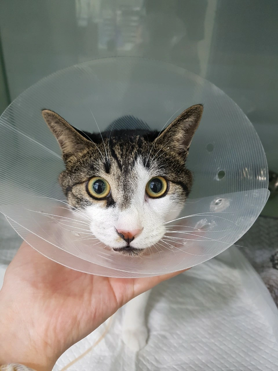 다음 날 아침, 병원에서 받은 사진을 보면 녀석의 표정이 한결 편안하다. 두 집사가 알 수 없는 곳에 자신을 맡겨두고 사라졌으니 버림받았다고 생각했는데 자신의 오해였던 것을 뒤늦게 깨달은 모양이다.