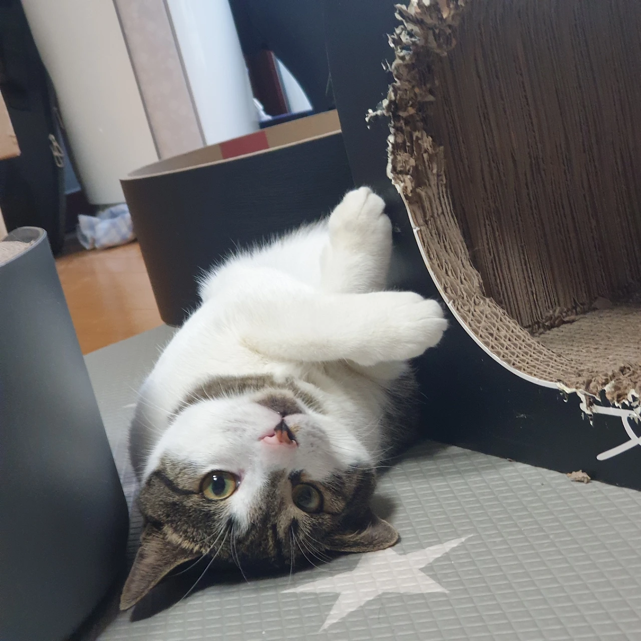 스크래처를 열심히 물어뜯다가 집사들 마음에 무슨 일이 있는 걸까
