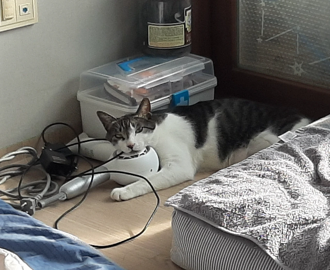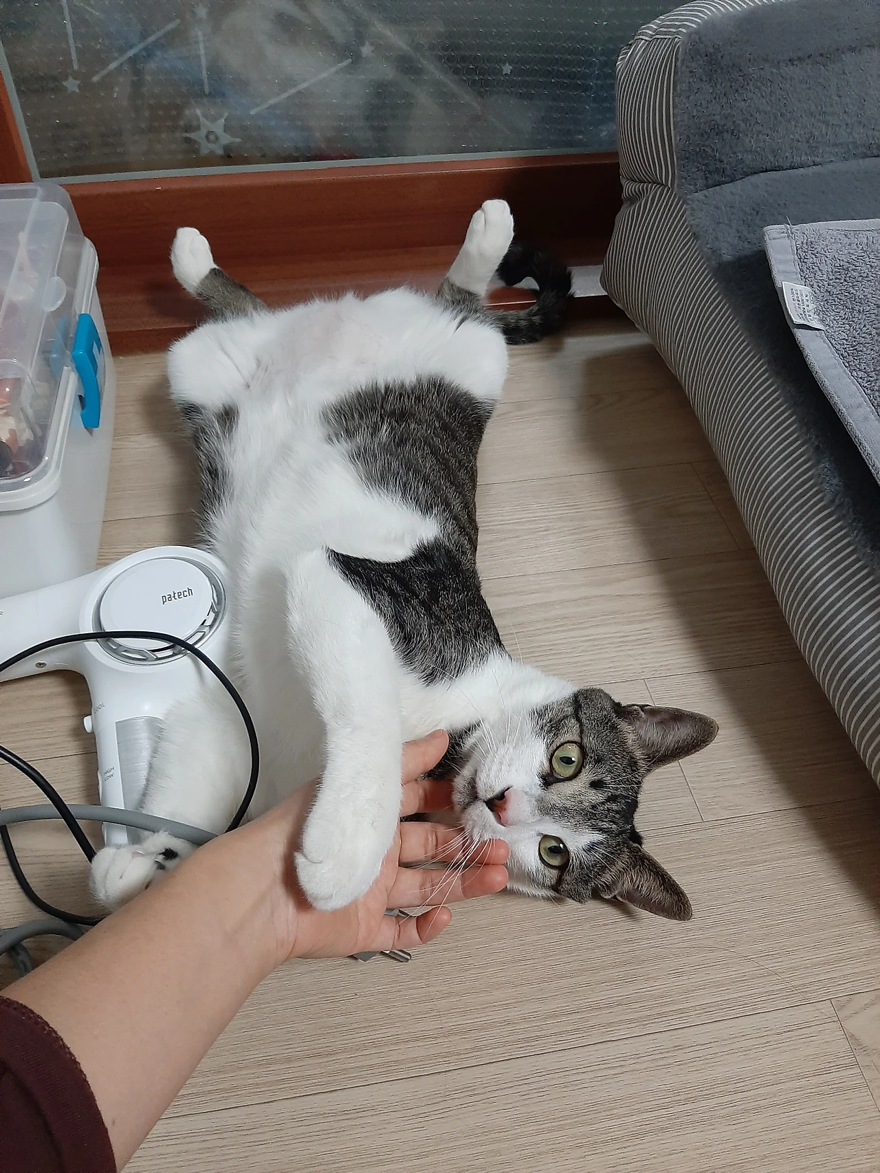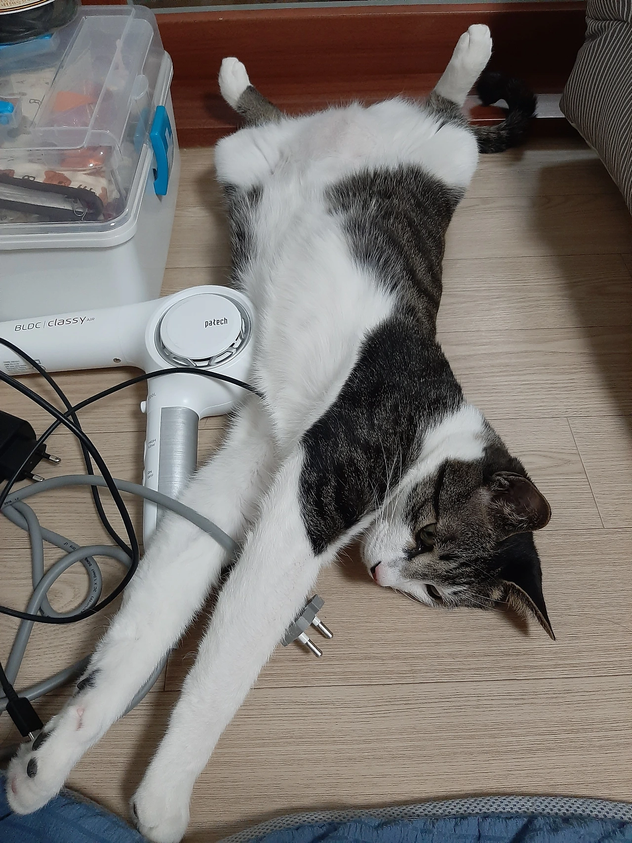 드라이기로 머리를 말리면 달려와서 냥냥펀치로 응징하던 드라이기도 애정한다. 치워주려고 하면 앞발로 끌어당겨 턱을 괸다. 줄이나 끈같이 길쭉한 것들도 꾹꾹 눌러보며 굉장히 좋아한다.