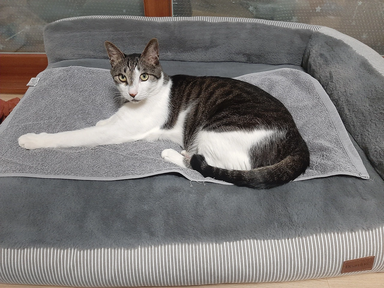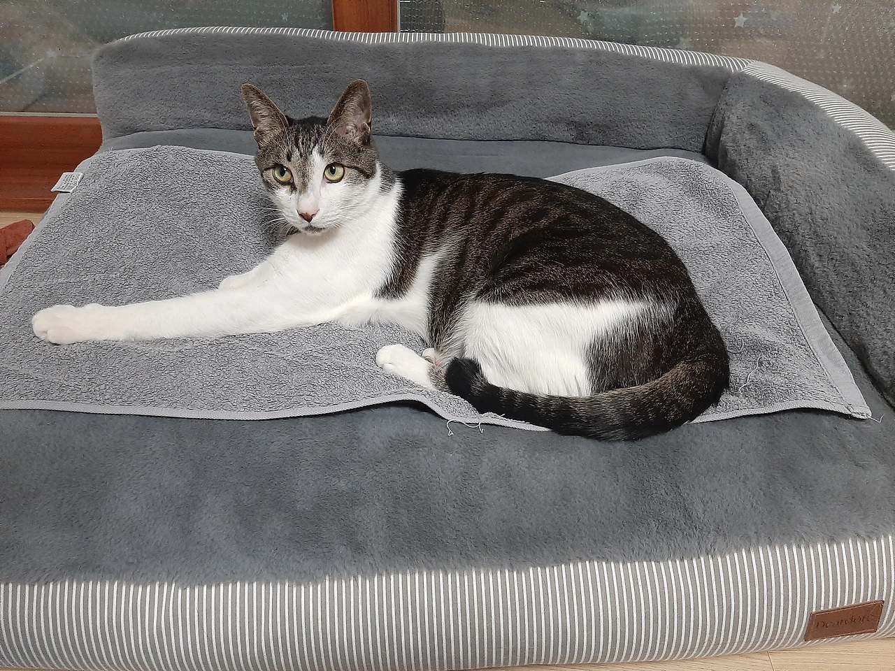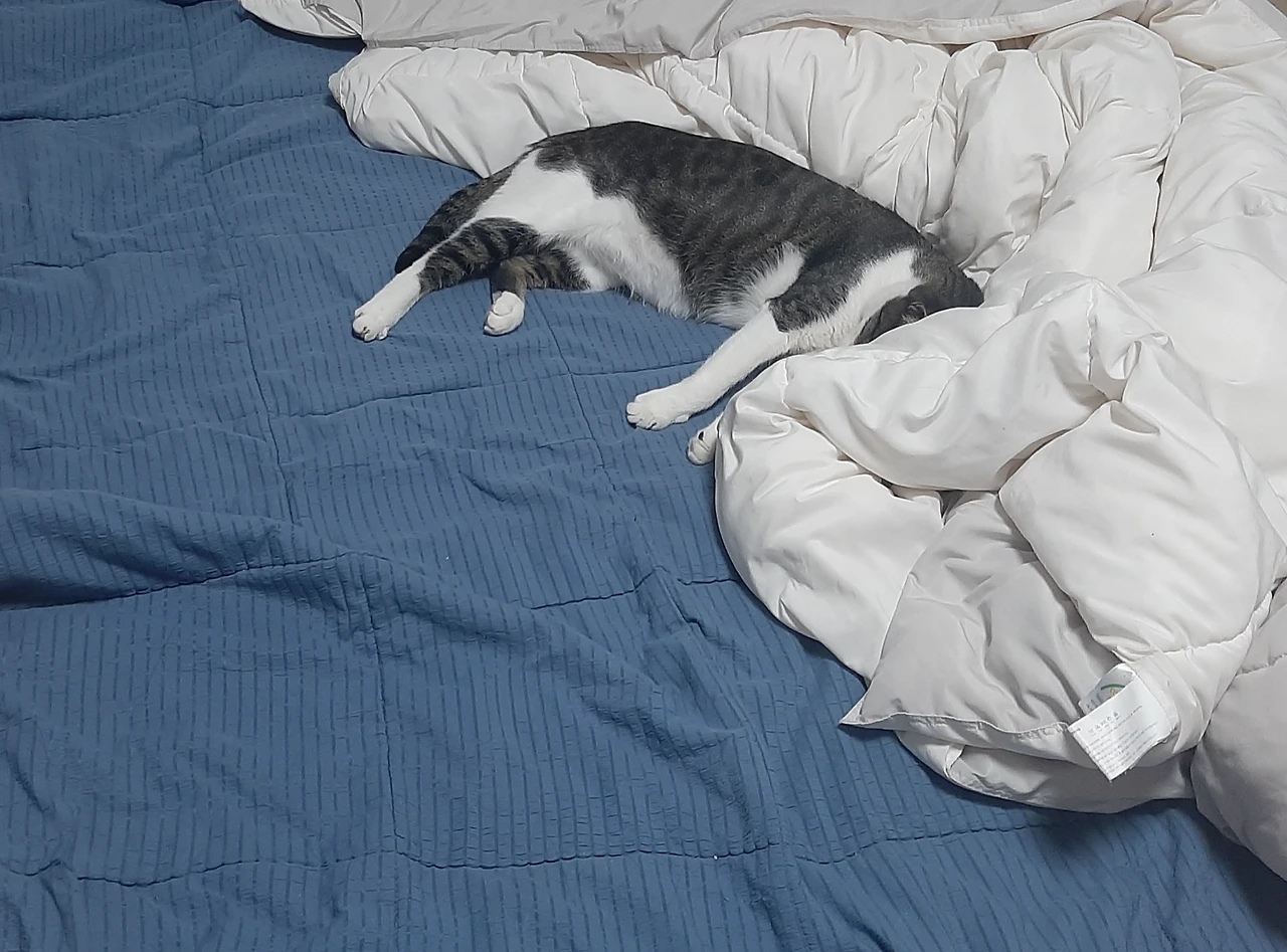 큰 집사 방에서 뒹굴뒹굴 거리던 오래가 갑자기 내 방으로 퇴근한 날이다. 어슬렁거리는 포즈로 내 눈을 마주치고 들어오는 것이 일반적인데 이 날은 들어오자마자 이불에 드러누웠다.