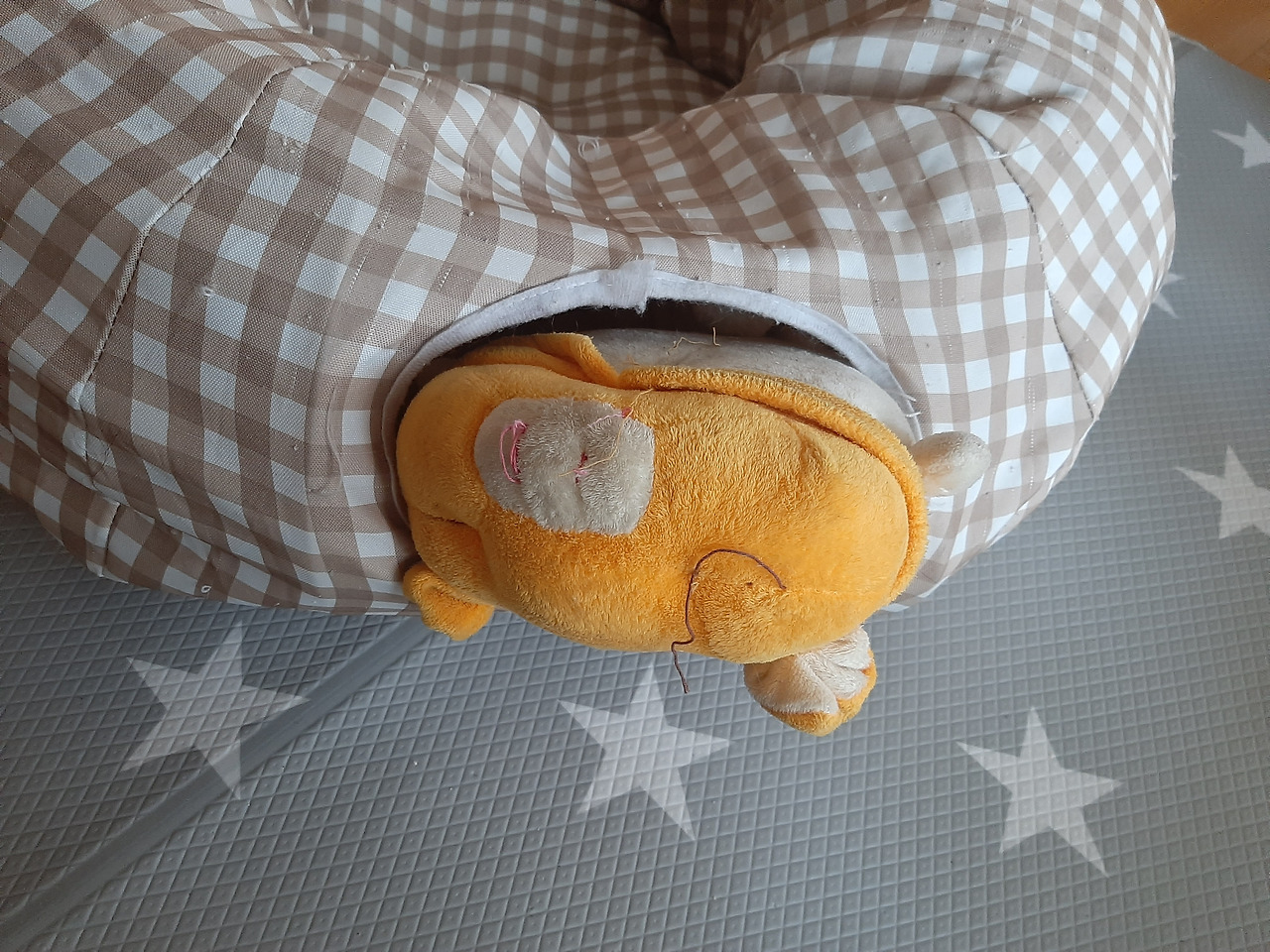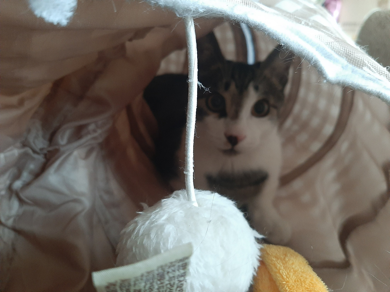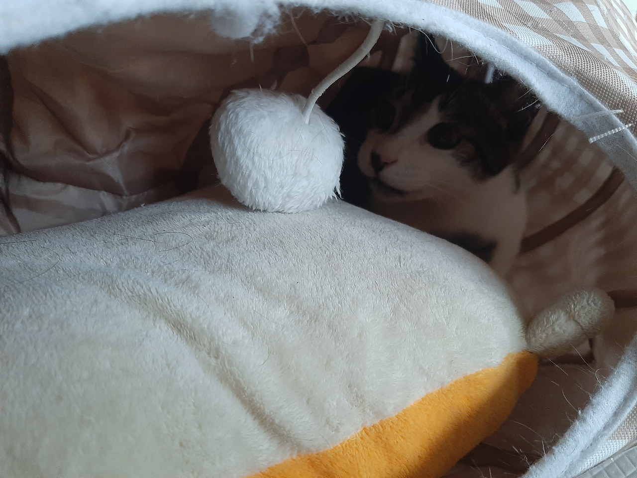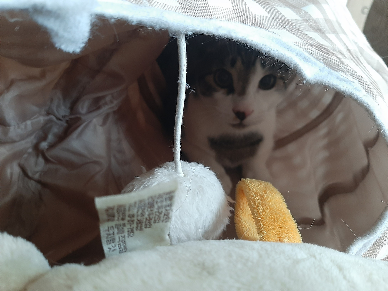 큰 집사가 인형을 캣터널로 넣어주었나 잠깐 의심했지만, 누가보아도 캣터널 지름보다 더 넓적한 돼지인형을 캣터널에 구겨 넣을 이유는 없는 것이다. 인형이 그 정도로 마음에 들었단 말이야? 아니면 인형과 캣터널에 함께 있고 싶었나, 오래의 마음을 정확히 알 길은 없지만 싫어했다면 저렇게 갖은 노력을 들여가며 돼지인형 엉덩이를 캣터널에 초대하진 않았을 것이다.