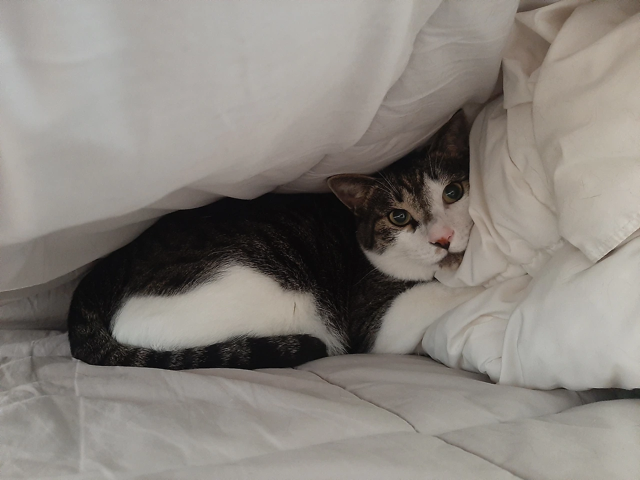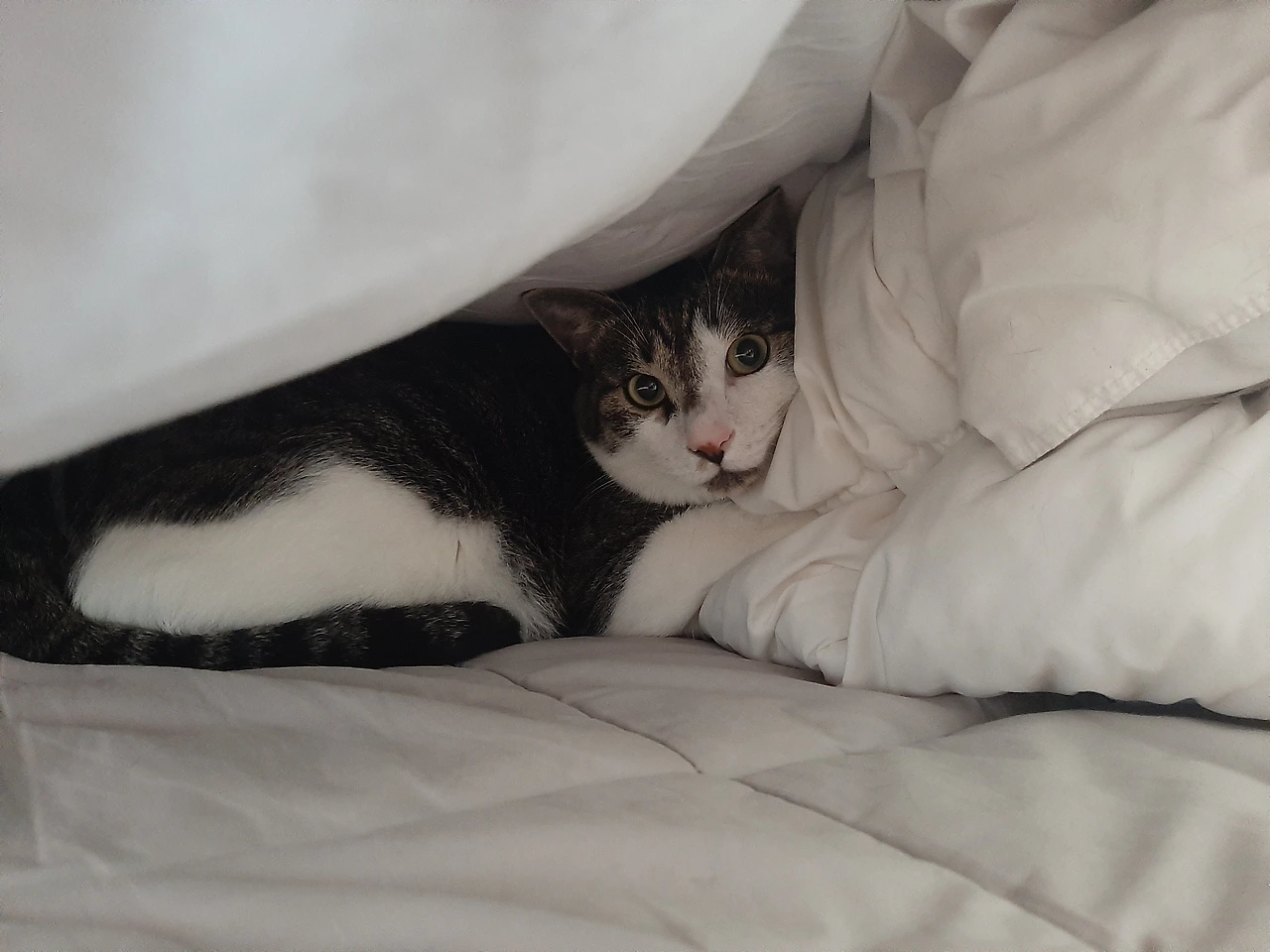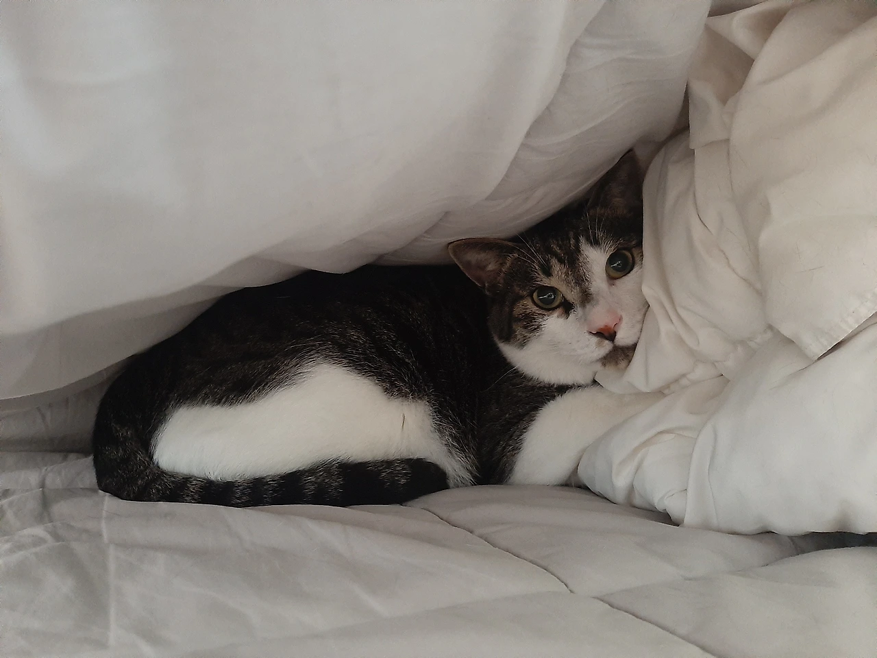 호기심이 많은 오래는 이불 속에 들어가 있을 때면 늘 코 끝이 보이도록 자세를 잡는다. 이불 안에서도 집사들의 행동을 관찰하겠다는 의지를 보여준다.