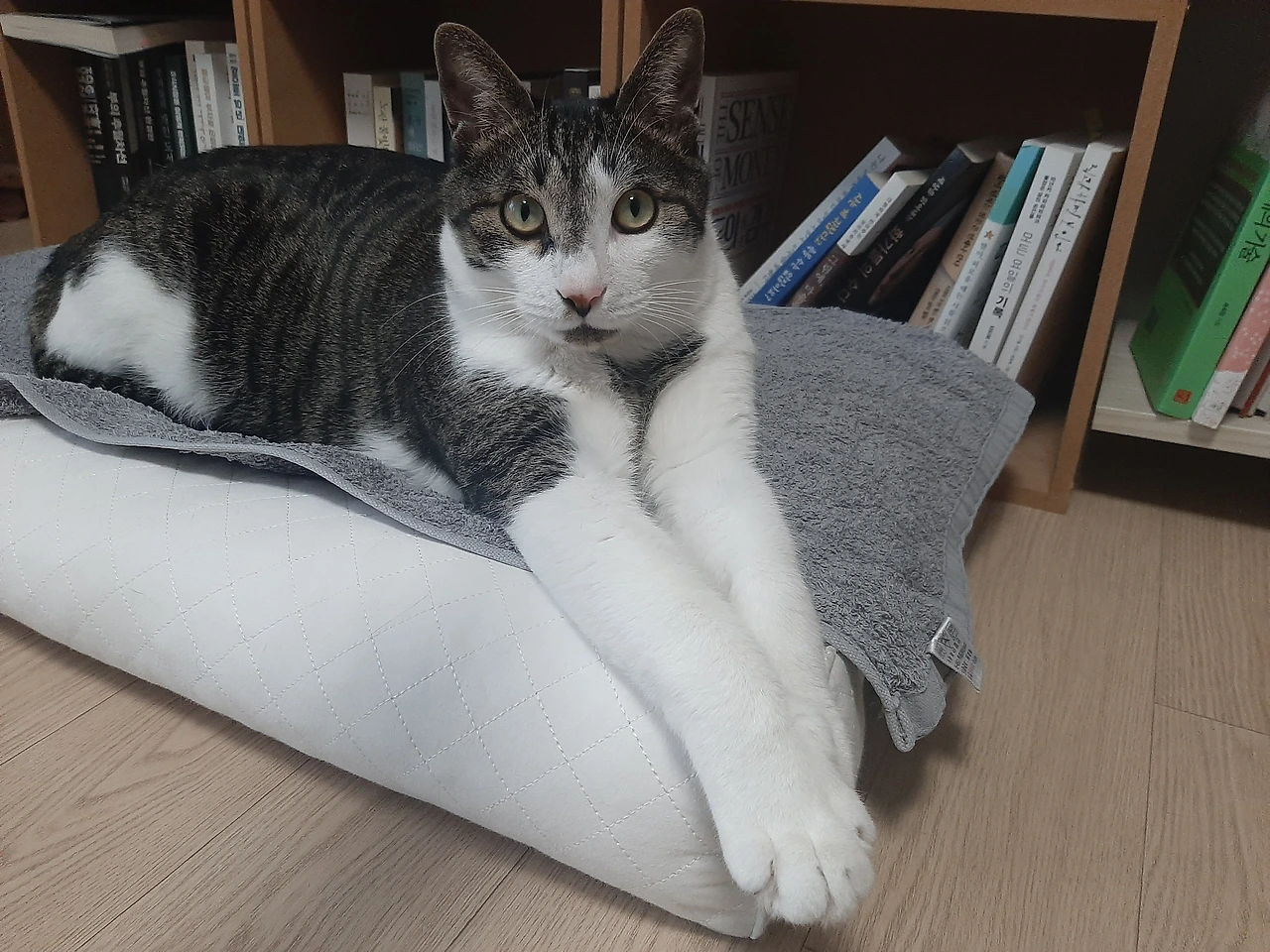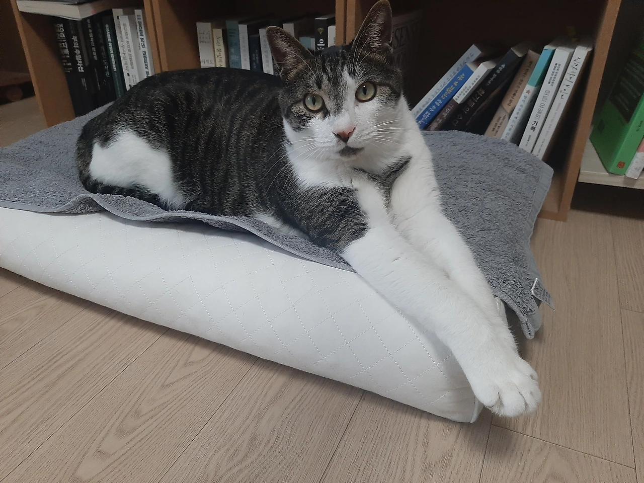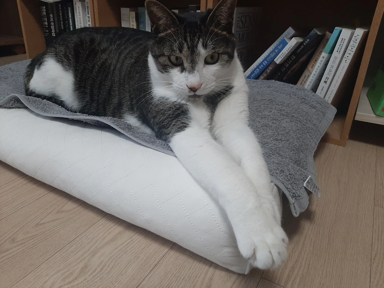앞발을 곱게 접어 식빵을 굽고 있는 모습만큼 앞발을 쭉 뻗고 앉아있는 모습도 사랑스럽다.