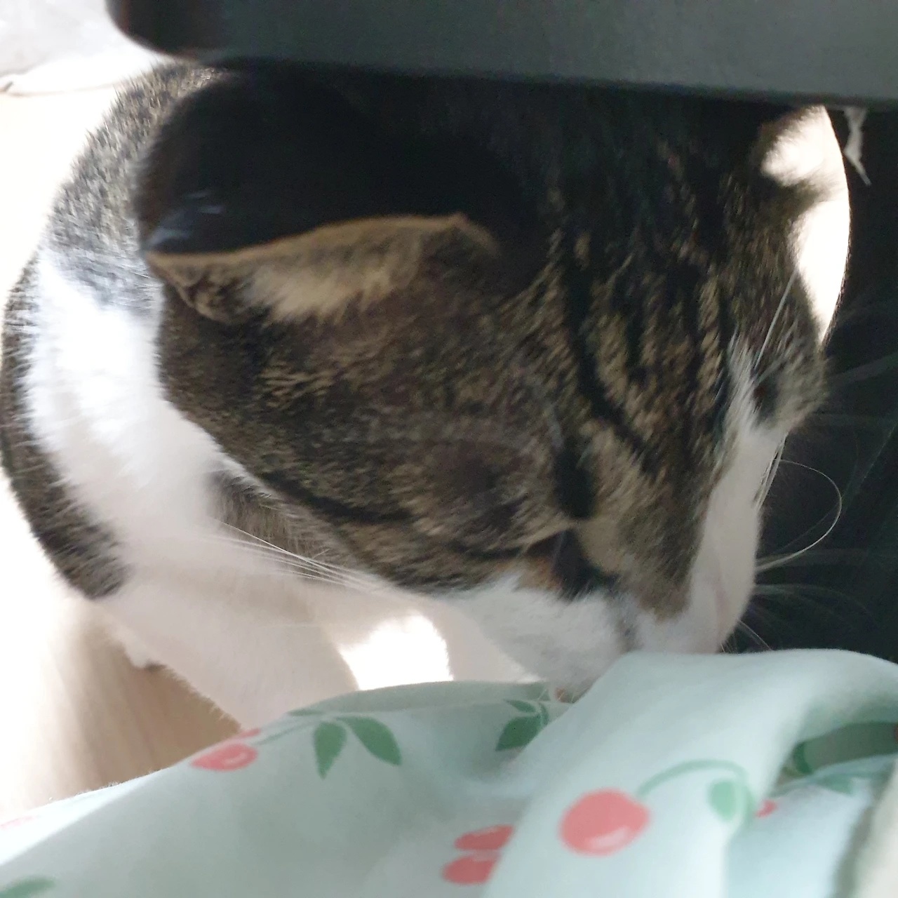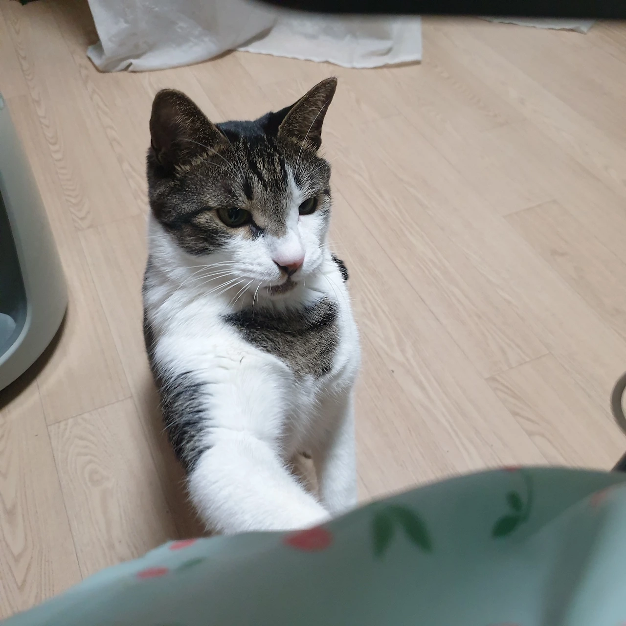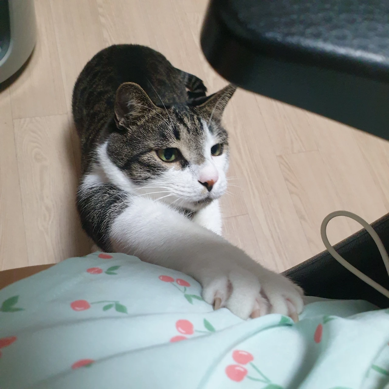 의자에 앉아 있는 큰 집사 옆에서 게슴츠레한 눈으로 눈치를 주는 녀석. 심심하니까 놀아달라는 표현이다. 발바닥으로 허벅지를 긁어보기도 하고 몸을 길게 뻗어 배를 때리고 도망가기도 한다.