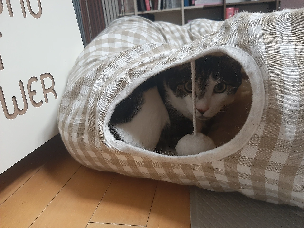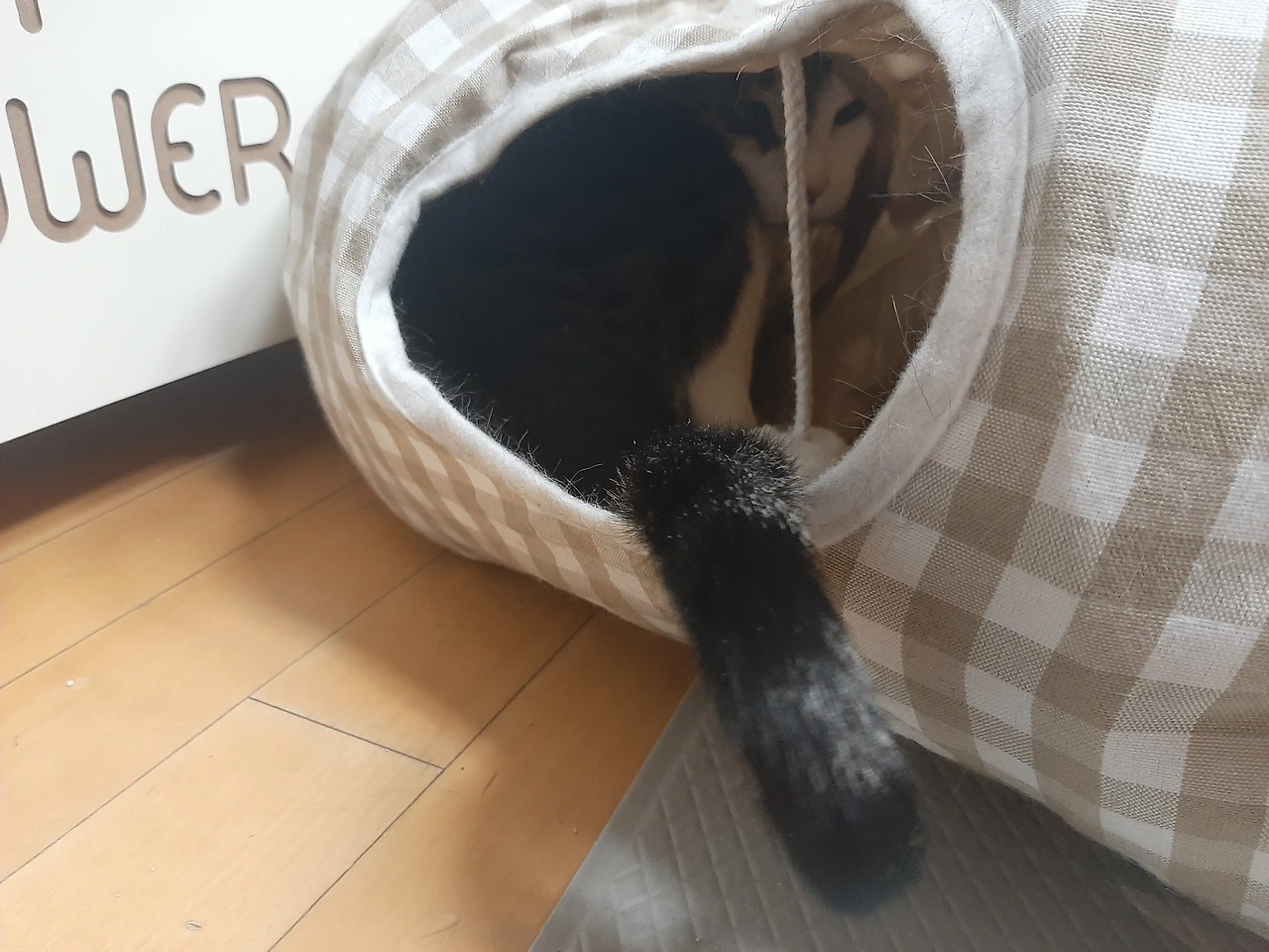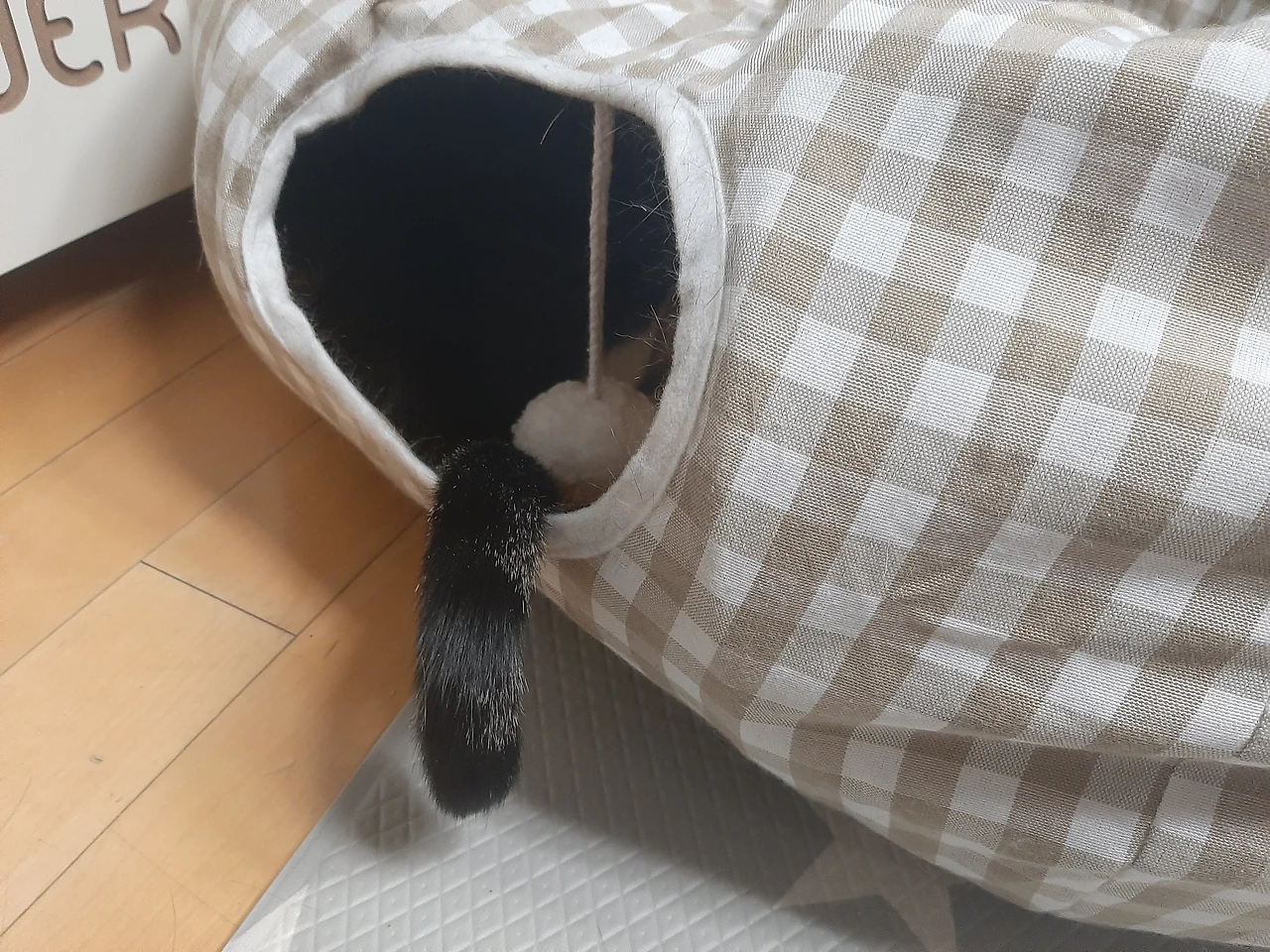 거실을 오가다 캣터널에 익숙한 모양이 삐죽이 튀어나온 것을 발견했다.