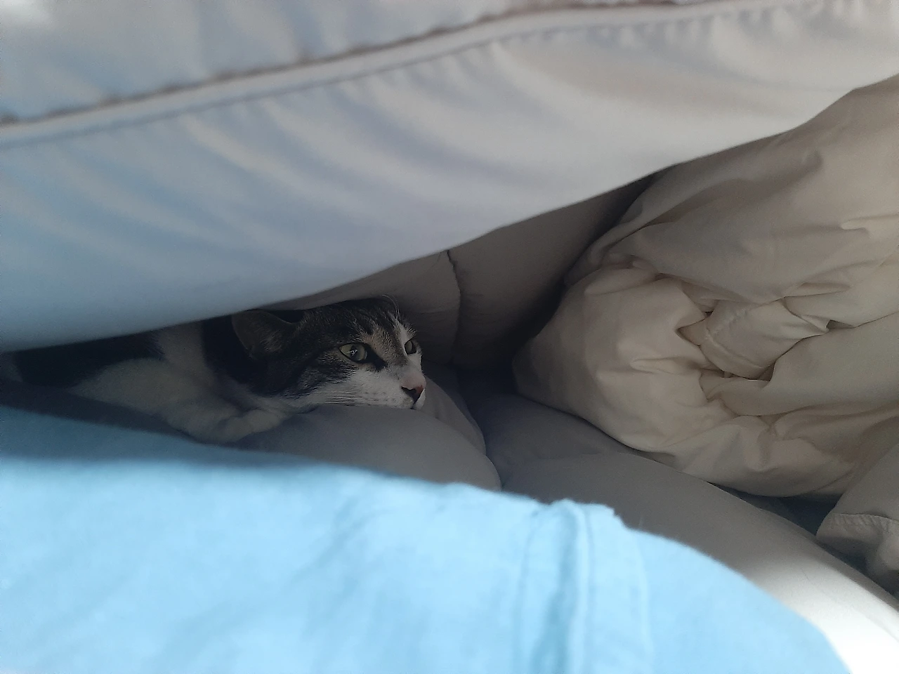 그렇게 냥냥 펀치를 날리고 토퍼 안으로 피신 중인 오래. 따뜻하고 흡족하다. 그렇게 늘어지게 한잠 자고 식사하고 물 먹고 또 한잠 자고 무한반복의 일상!