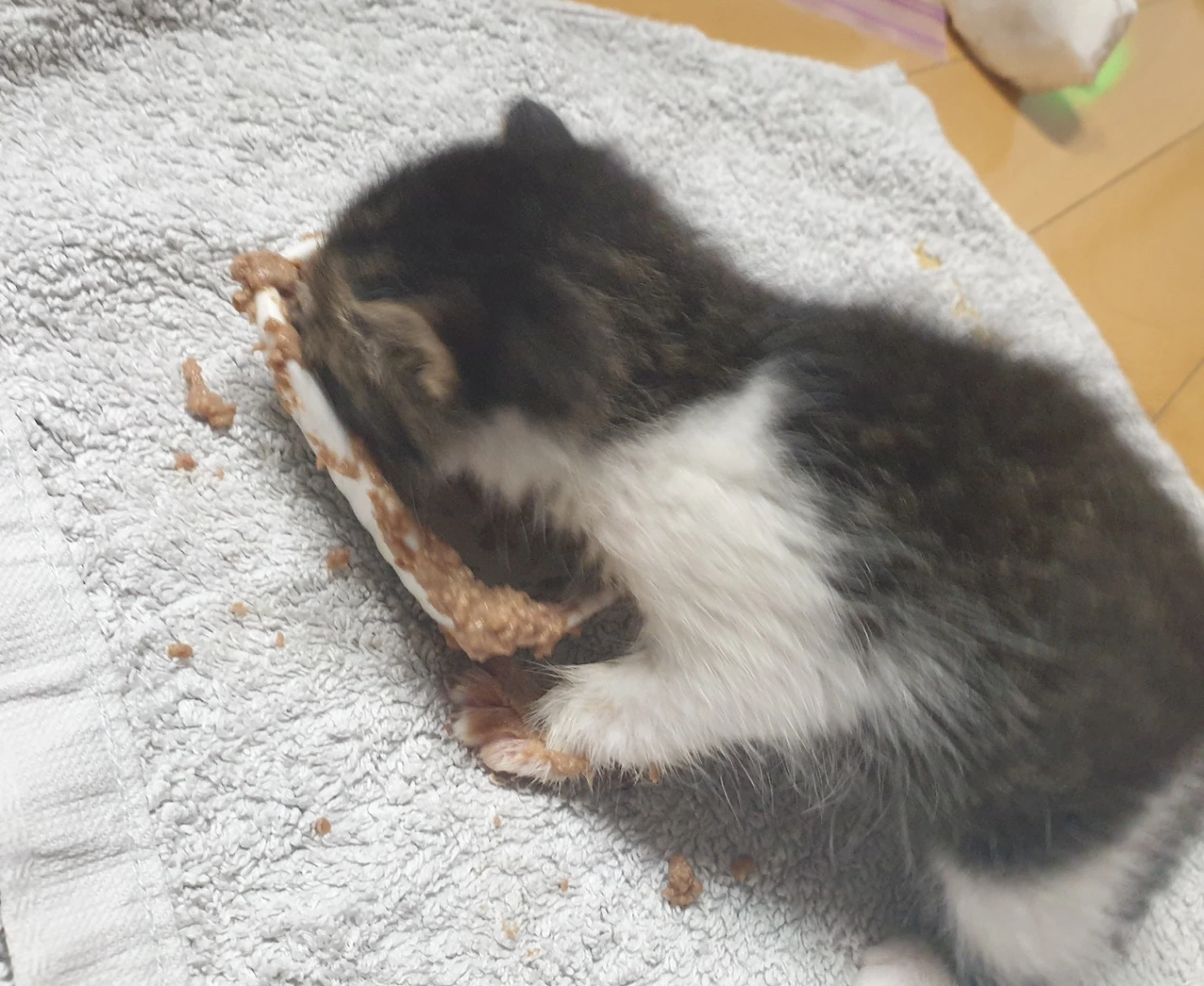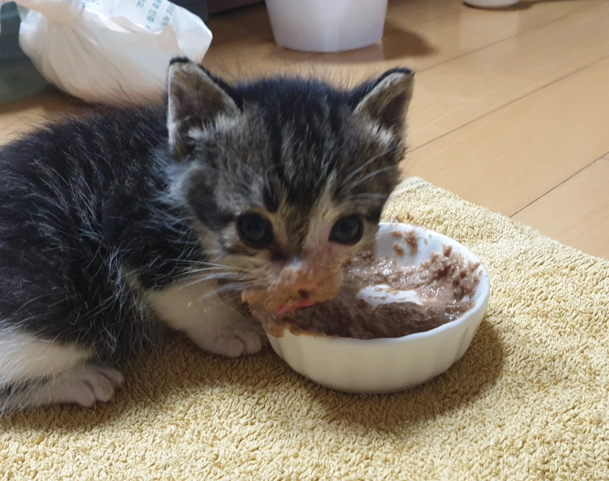 분유만 먹이려 하면 먹지 않아 키튼용 습식에 분유를 섞어서 이유식처럼 먹였던 시기이다. 젖병도 싫어하고, 주사기도 싫어했던 녀석. 본인 성질대로 먹어야 했던 나름 주체적인 성격의 소유자였다. 식사 때마다 이유식 범벅이 되는 통에 몸에서 꼬릿꼬릿한 캔 냄새가 가실 날이 없던 날들이었다.