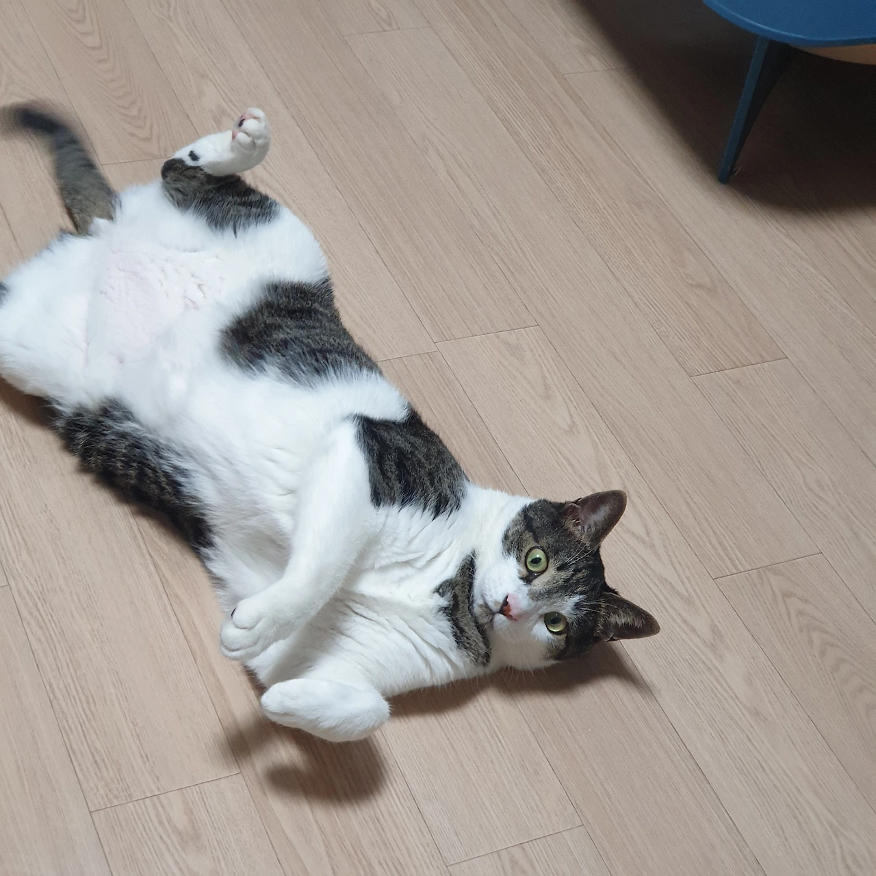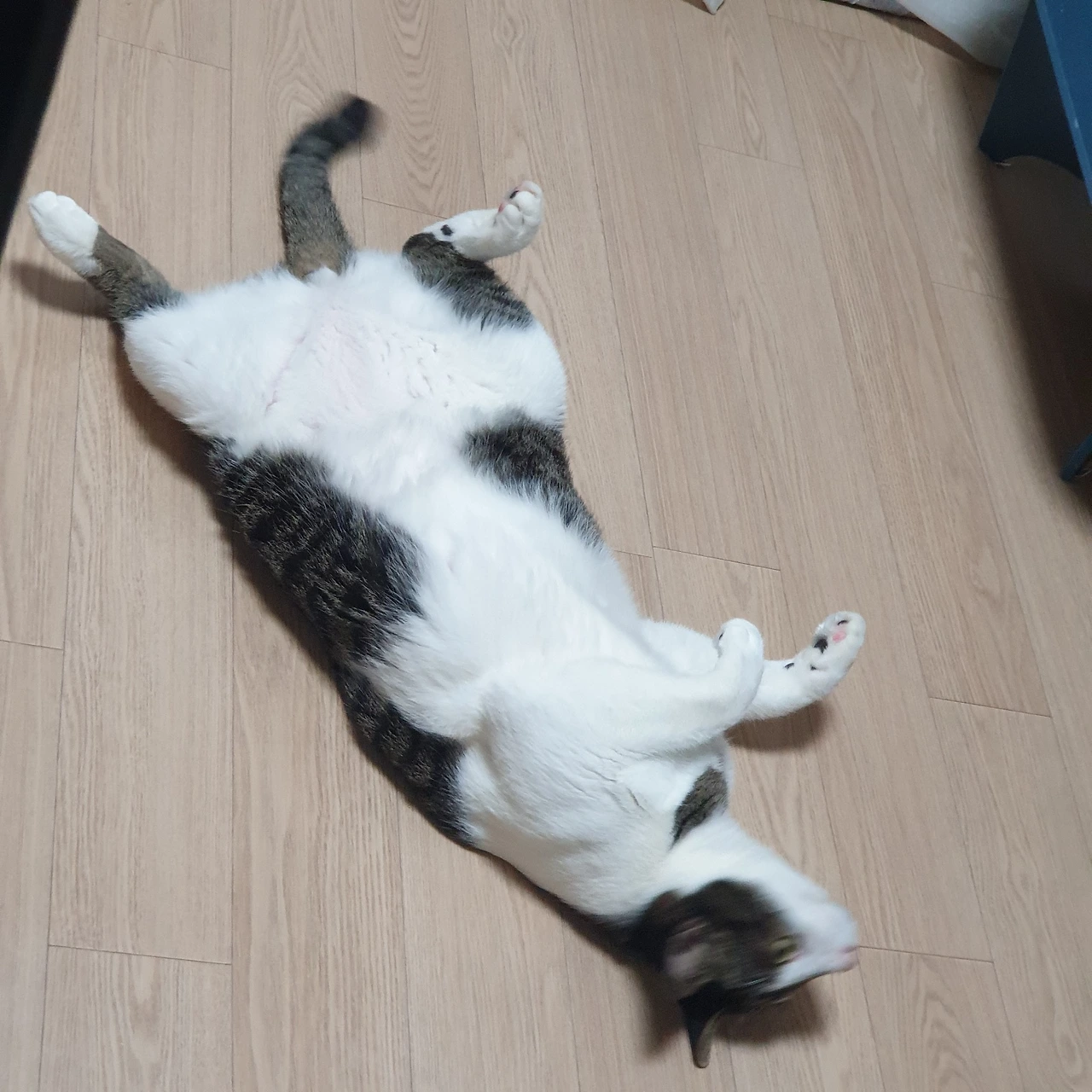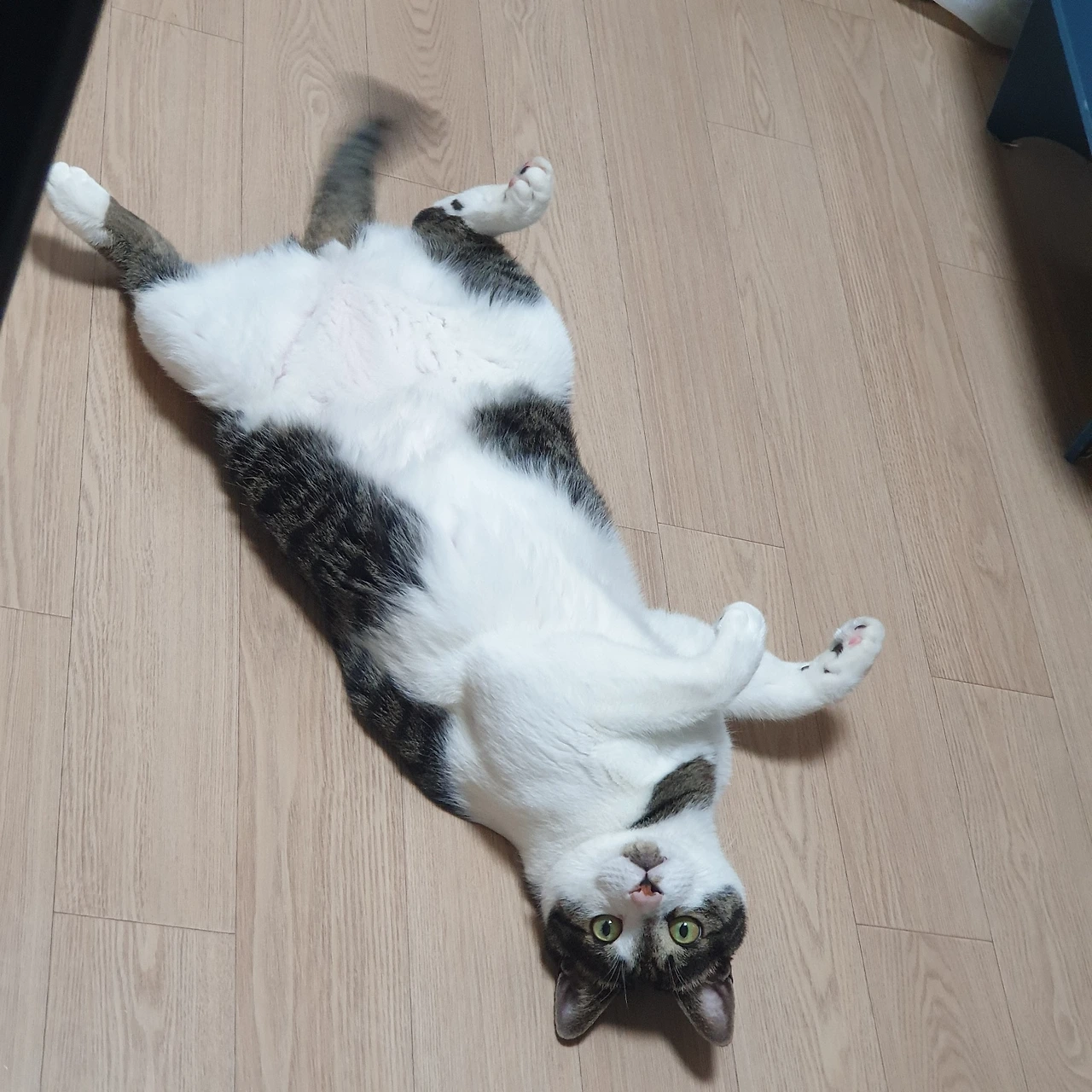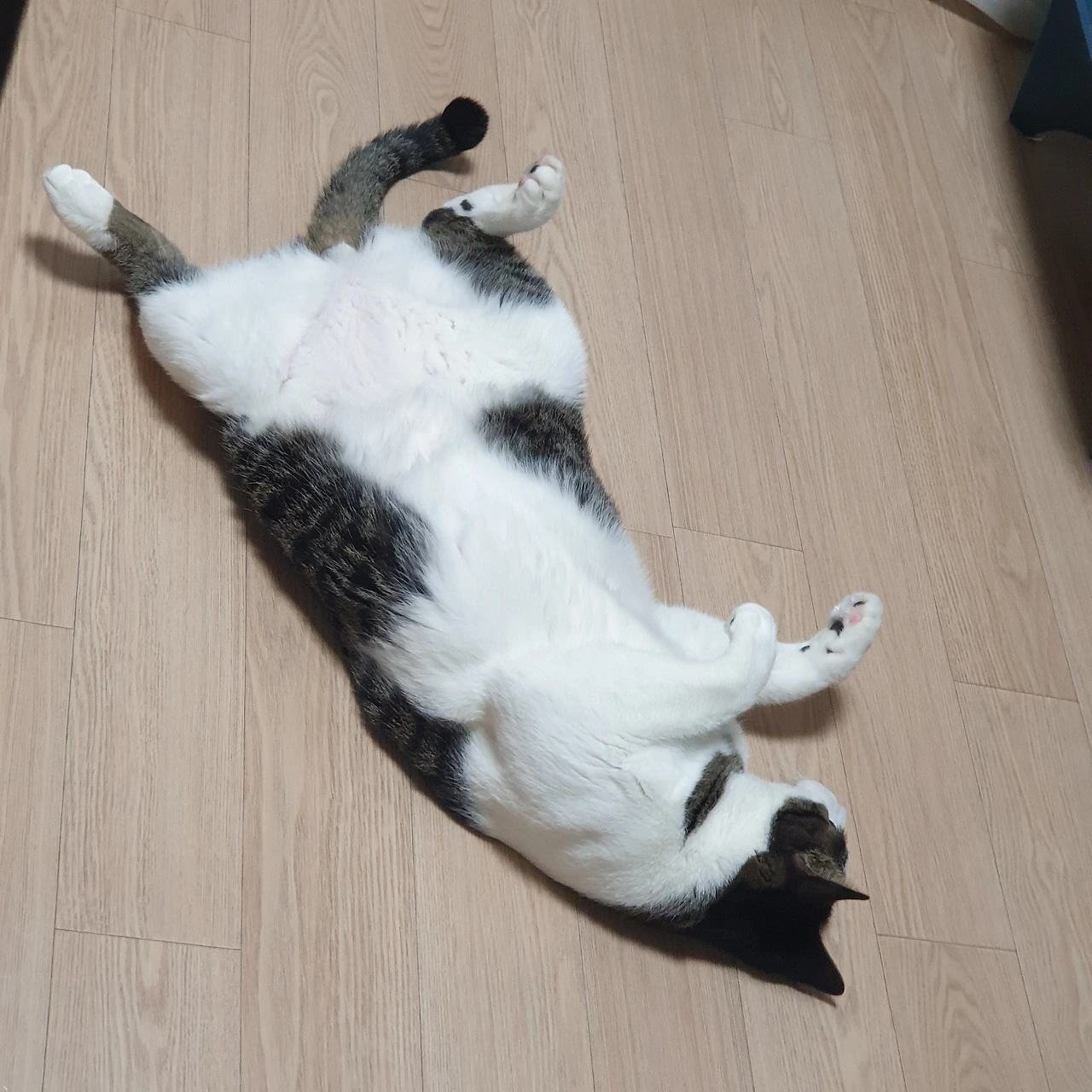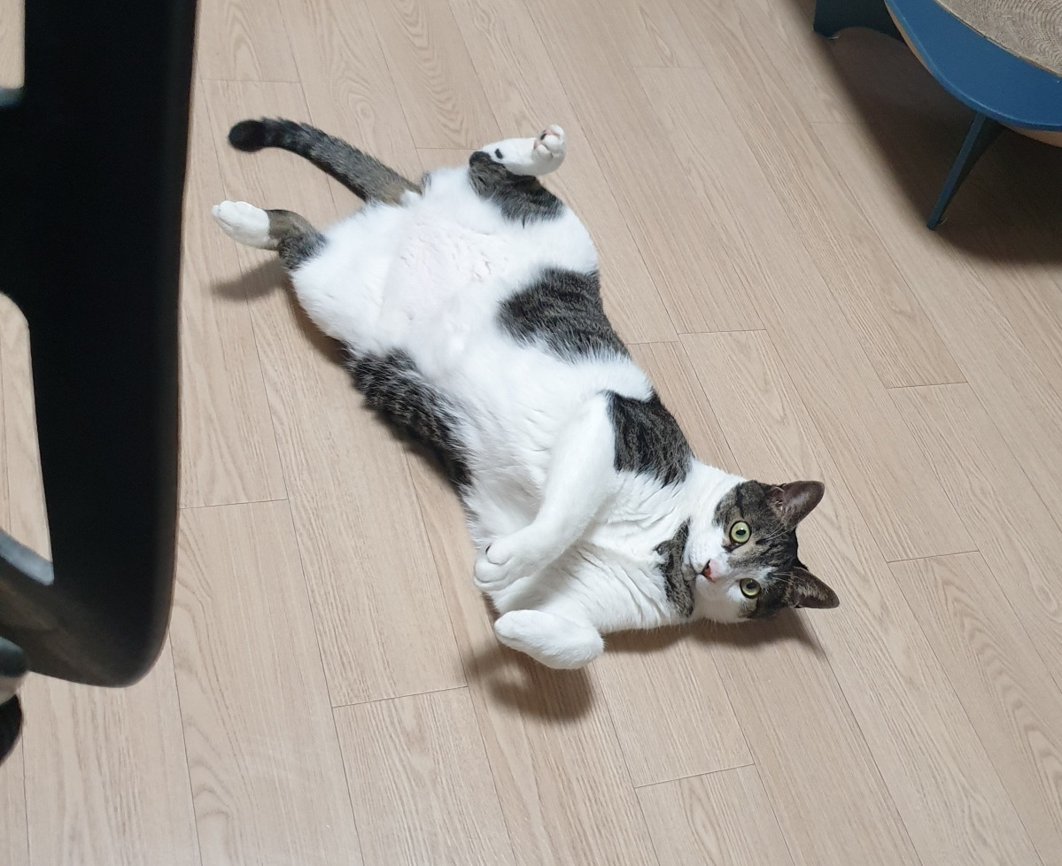 큰집사 방에서 뒹굴뒹굴, 방바닥에 누워서 쉴 새 없이 꼬리를 흔드는 중.