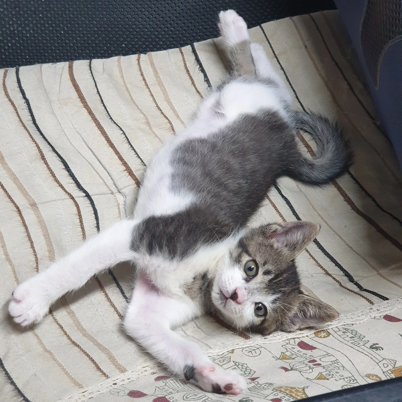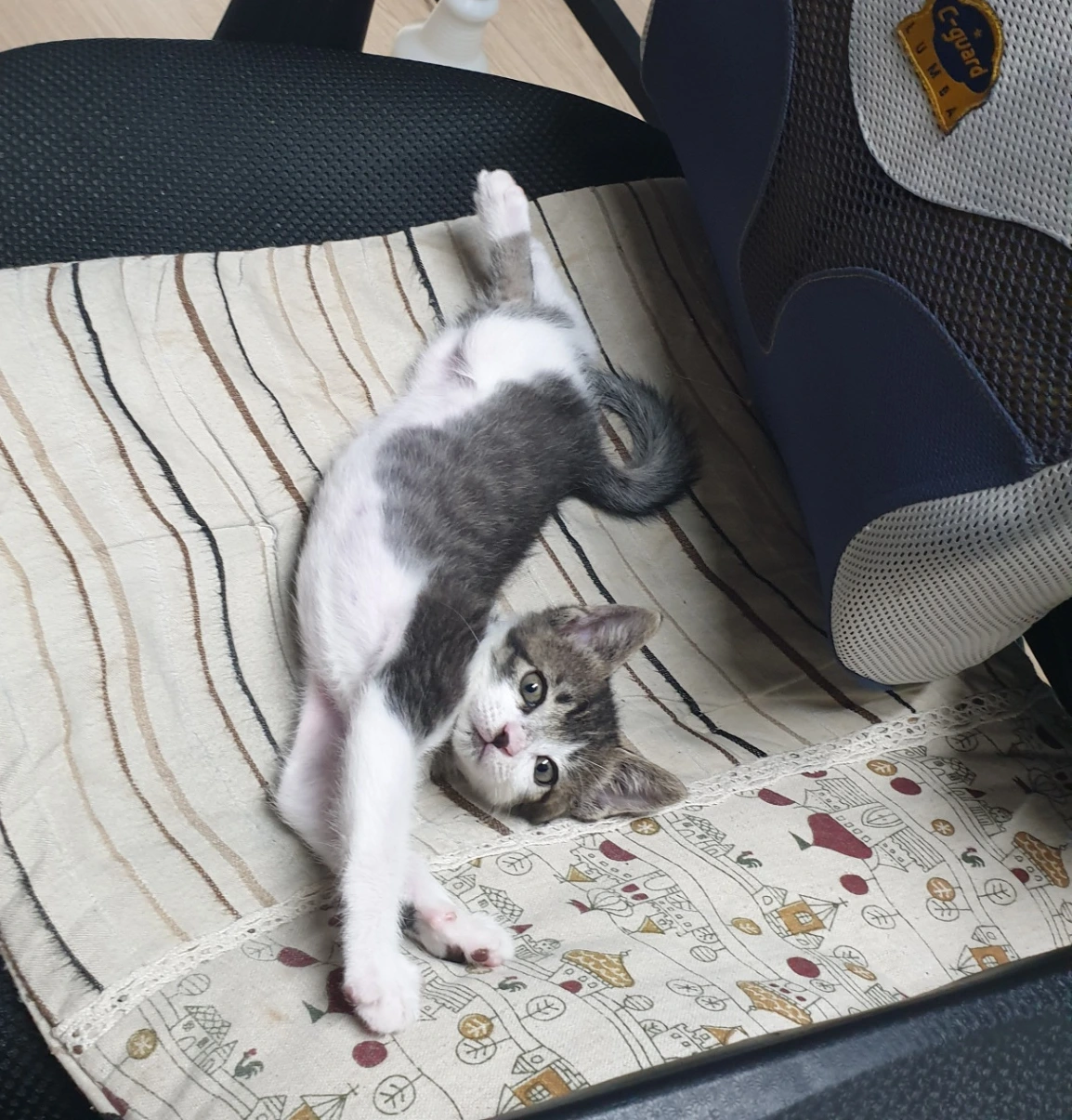언니 의자에서 좀처럼 내려오지 않는 녀석. 얌전하다가도 어찌나 깨방정인지. 말괄량이 같지만 사실은 개구쟁이 아들이다. 가끔씩 딸내미 같은 착각을 불러일으킨다. 식빵 굽는 자세는 아직 어설프다. 이보다 더 어릴 땐 앞발이 짧은지 식빵 굽는 자세가 완벽하게 되지 않아서 꽤 웃긴 포즈로 앉아있곤 했다.