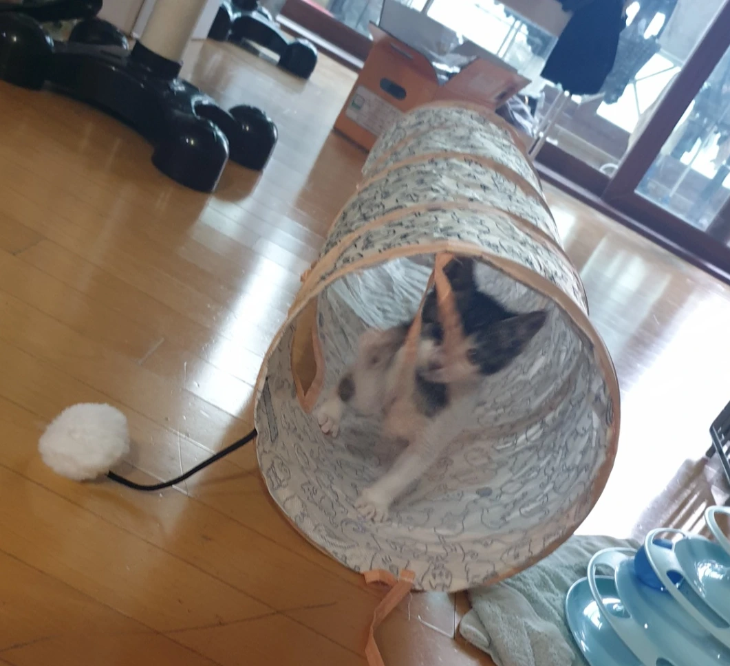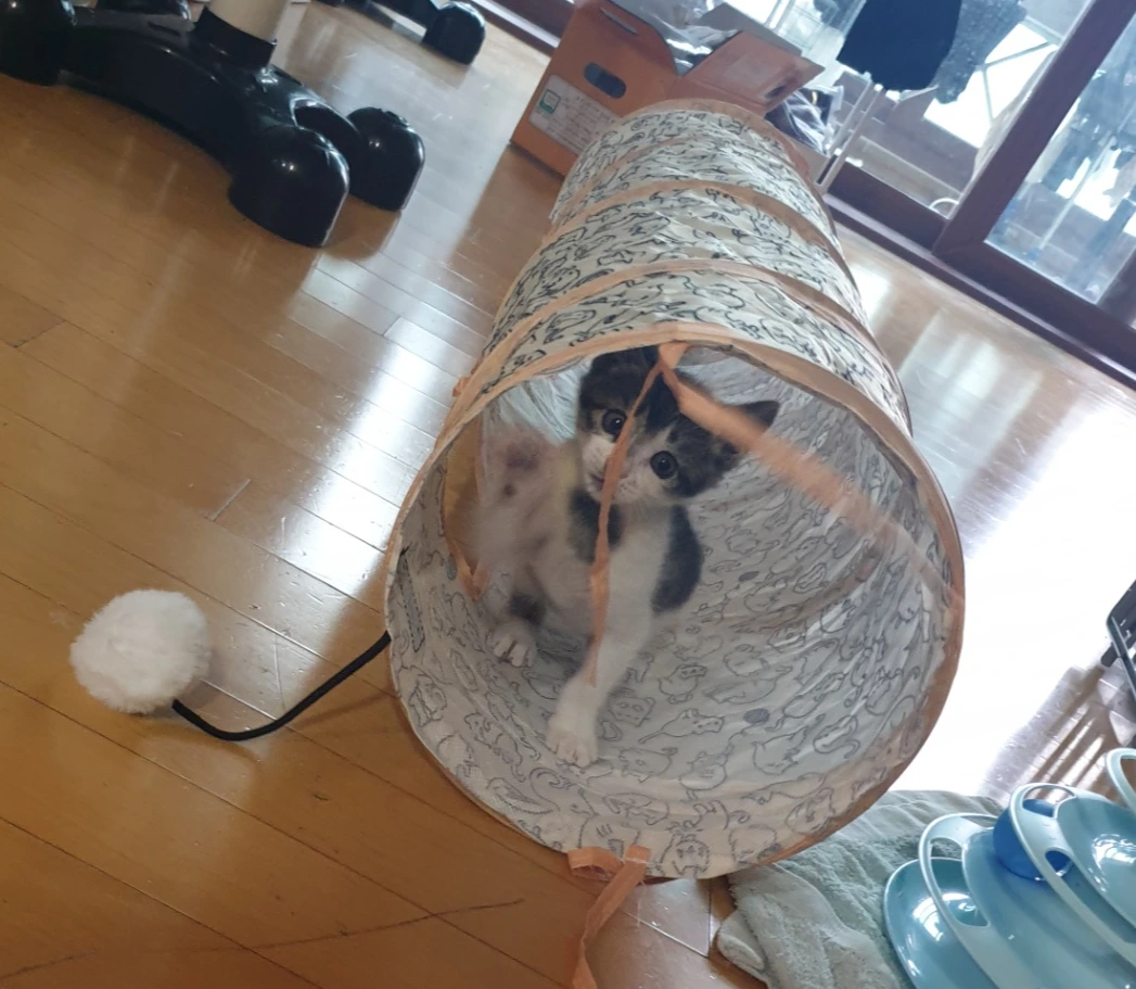 새로운 고양이 용품을 들일 때마다 녀석의 경계가 심했다. 언니와 나의 옆에 꼭 붙어 있거나 털을 세우고 꼬리를 부풀린다. 우리가 보기엔 별 것 아닌 것에 예민한 것이 귀엽기도 하고 웃기기도 하다. 경계심을 없애주기 위해서 새 물건을 툭툭 건드리고 때려보기도 하면서 위험하지 않은 것을 알려준다.