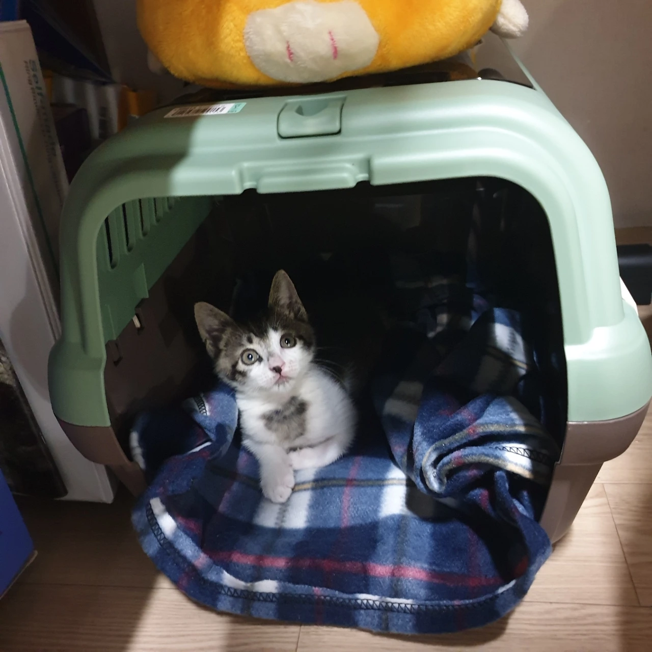 큰엄마 껌딱지라 이동장을 책상 밑에 놓아주고 숨숨집으로 사용하도록 해보았다.
