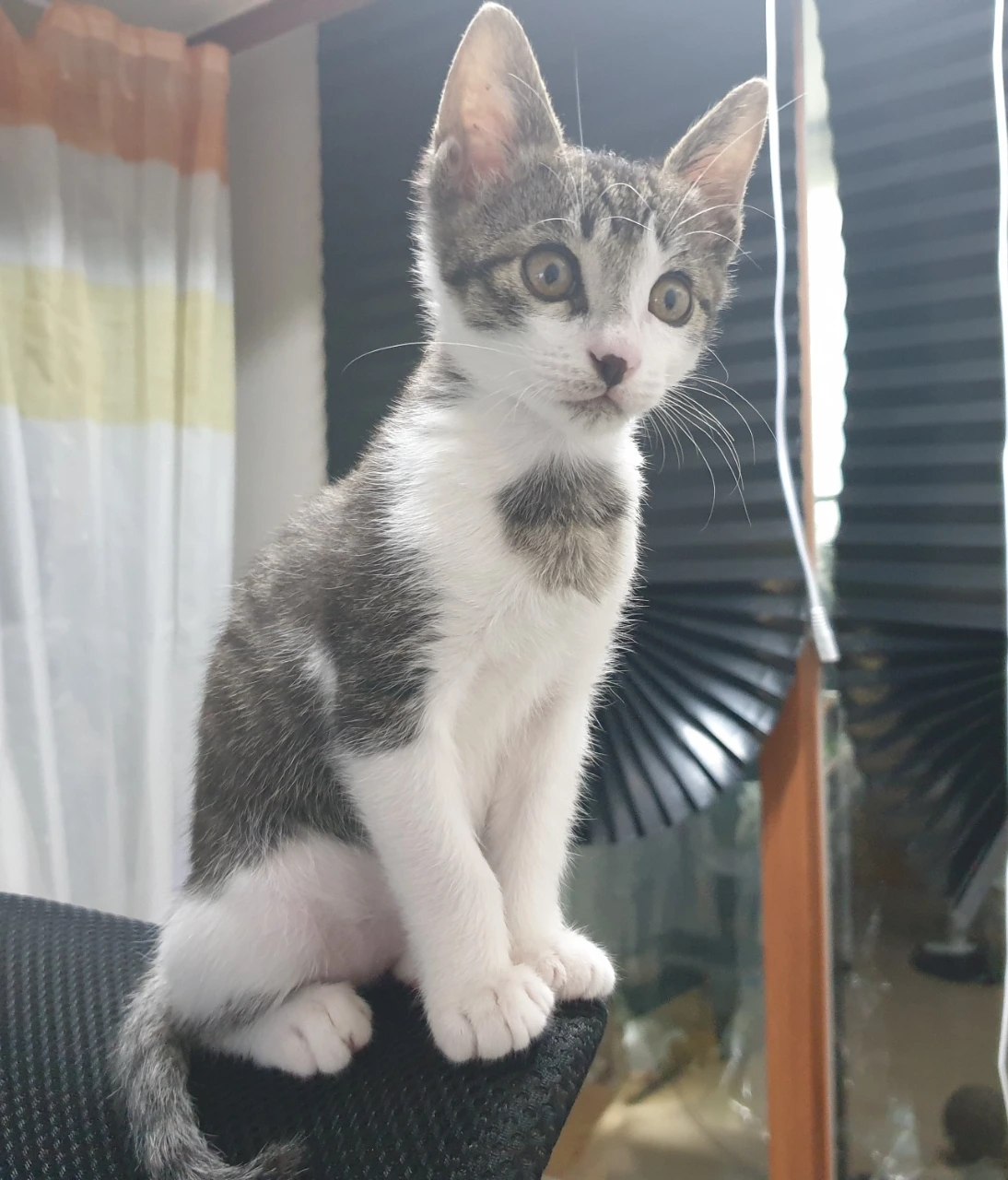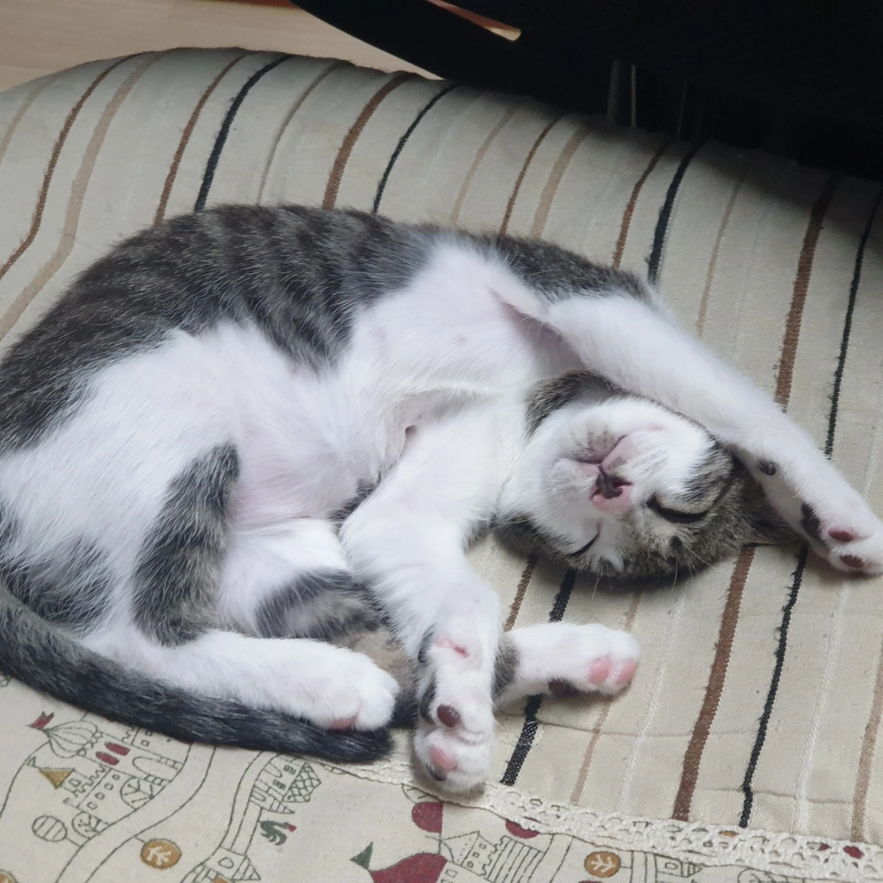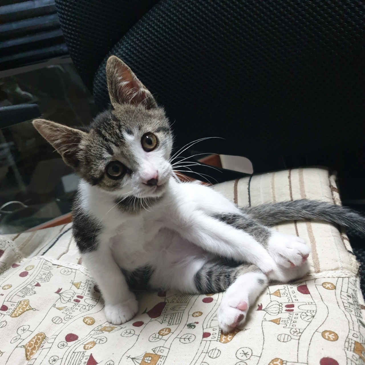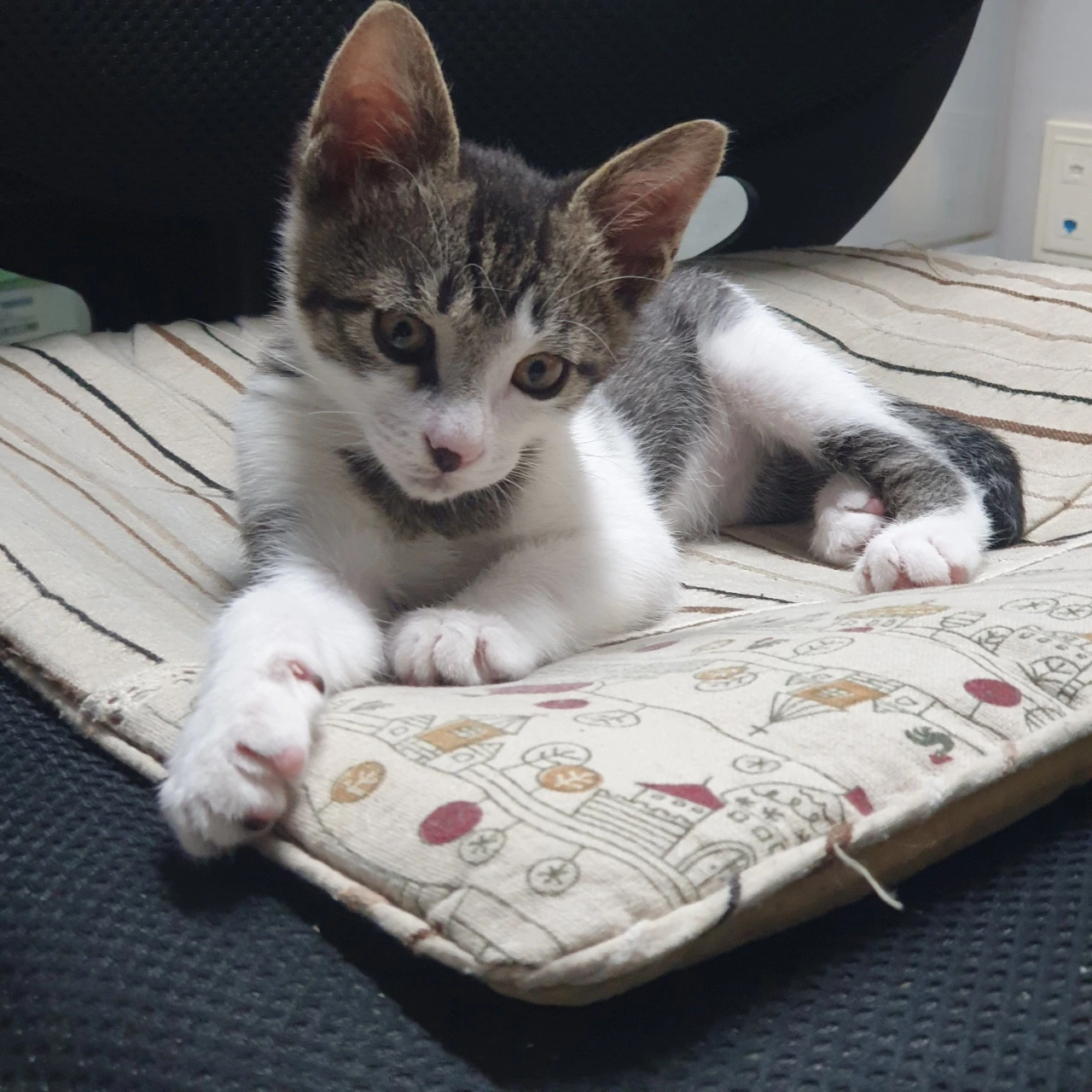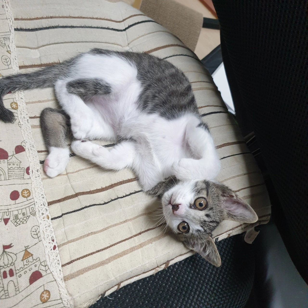 중성화 수술을 해야 하는 시기가 다가올수록 점점 더 고양이스러운 행동이 늘어갔다. 언니 책상에서 서식하는 생활에서 의자 등받이도 점령했다. 누가 가르쳐주지 않아도 혼자서 잘 올라다니고 균형을 잘 잡는 것을 보니 '고양이 맞는구나!'싶다. 아직까지 눈동자 빛깔은 어설프다. 언니와 찍은 사진을 보면서 눈빛이 못돼 졌다며 한참을 웃었다. 변한 것은 없지만 눈빛깔로 인상이 달라 보이니 이보다 더 어색할 수는 없었다.
