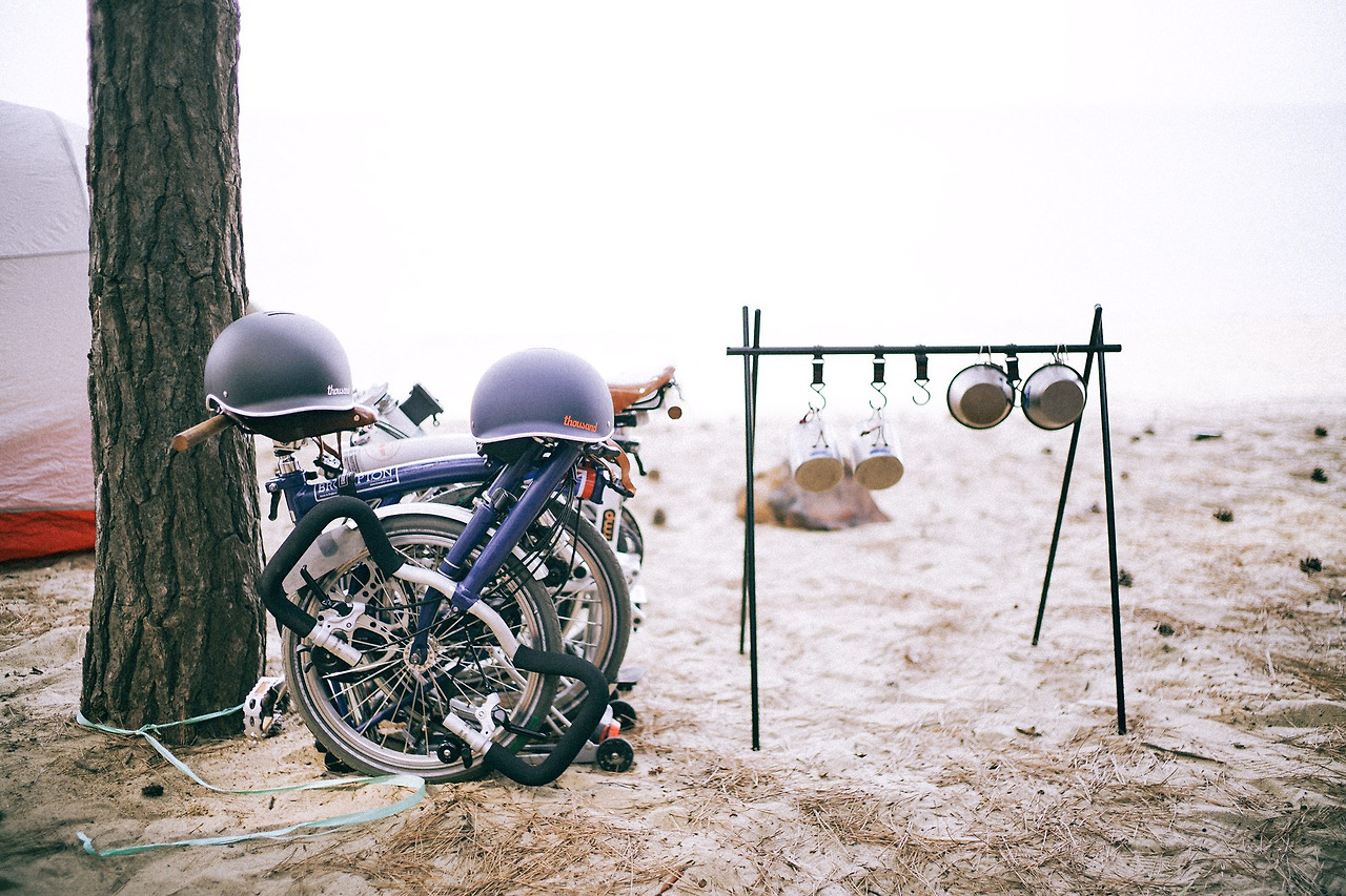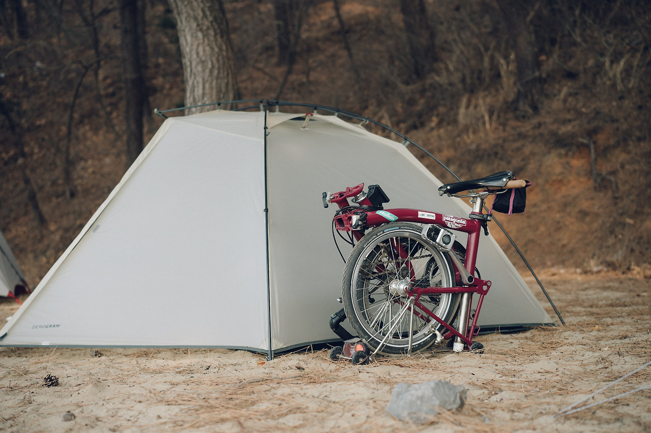 브롬톤을 곱게 접어 텐트 옆에 세워놓는다.