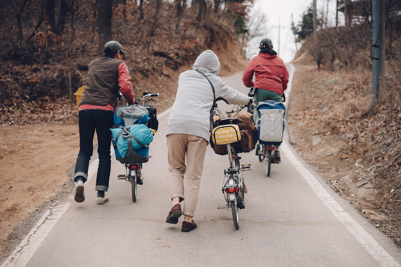 오르막을 낑낑대며 오르던 우리 옆을 자동차 한 대가 무심하게 지나쳐간다.