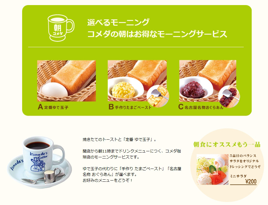 나고야에는 도요타를 중심으로 부라더공업, 노리타케 도자기 등 굴지의 기업들이 많은데, 공장으로 출퇴근 하는 사람들이 아침에 간단히 식사와 커피를 즐기면서 이러한 나고야식의 모닝 커피 문화가 생겨났다고 한다.
