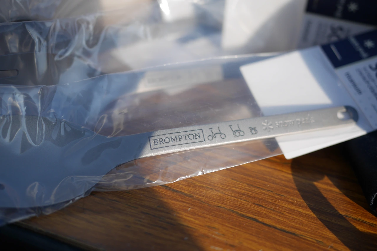2018 BWC Japan의 기념품입니다. 브롬톤 로고가 새겨진 테이블 매트와, 마찬가지로 브롬톤의 로고가 새겨진 스노우피크 티탄 스포크 (스푼+포크)입니다.