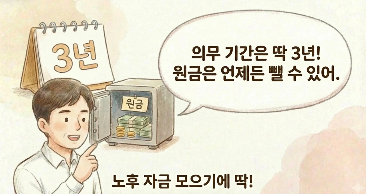 나 : "최소 3년은 유지해야 혜택을 온전히 받아. 하지만 우리가 원금 정도는 언제든 꺼내 쓸 수 있으니까 너무 걱정할 필요는 없어.