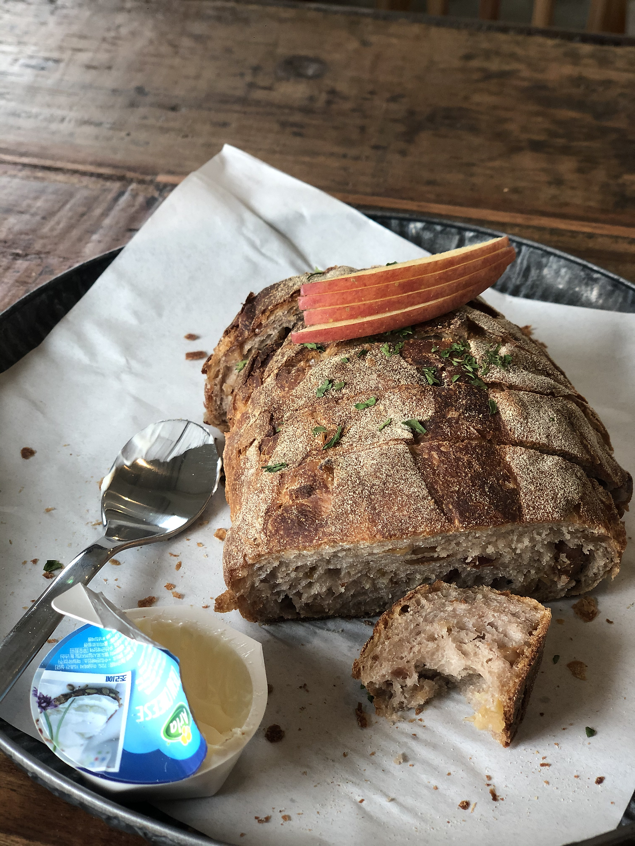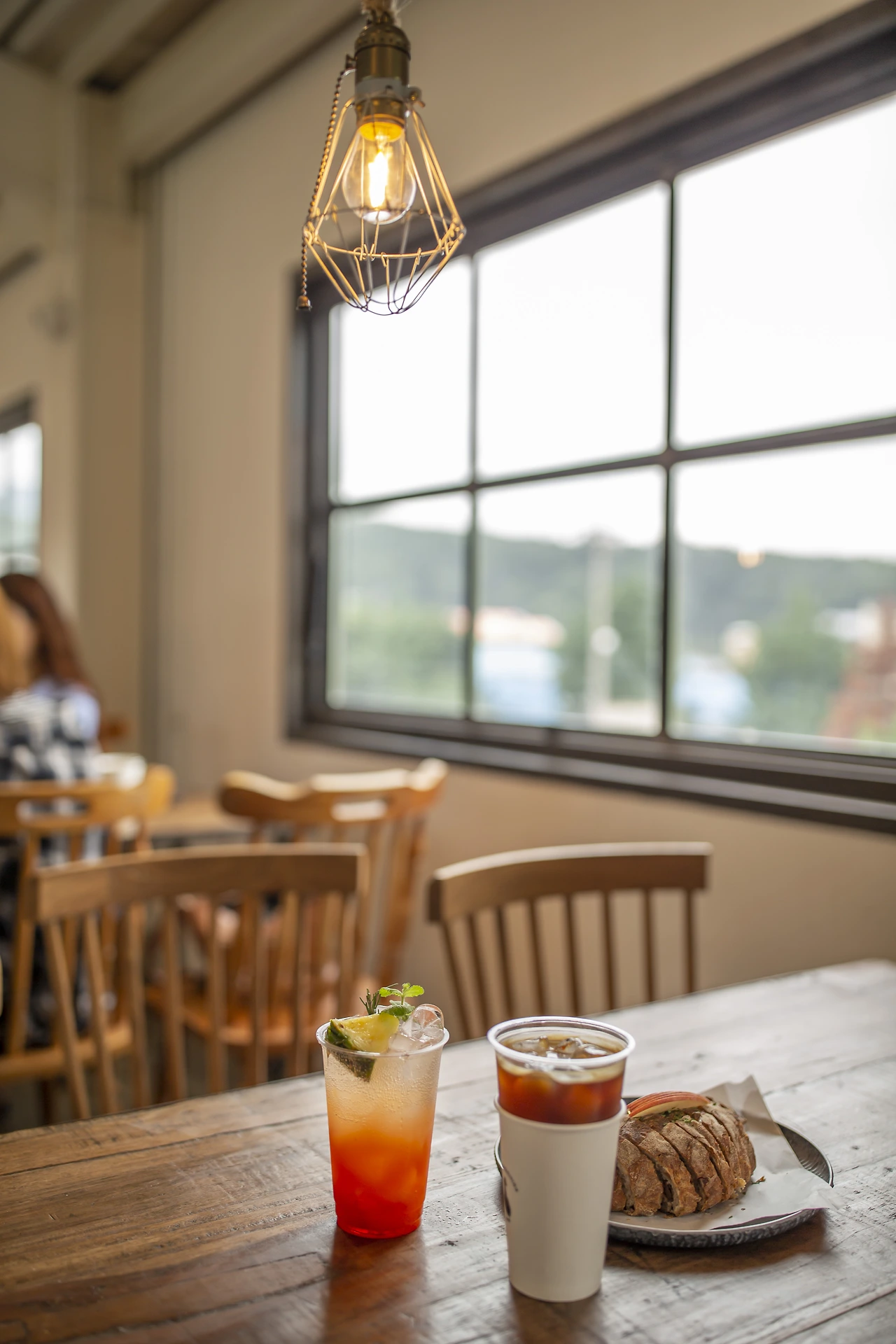 먼저 2층에 올라가 자리를 잡고, 음료를 주문하러 1층으로 내려갔다. 사전조사 없이 그냥 갔던 터라 잠시 무얼 주문할지 고민했지만, 앞에서 바로 구워 김이 올라오는 깜빠뉴를 썰고 있는 직원분을 보고 주저 없이 깜빠뉴를 주문하고. 기본 음료인 아메리카노와 뭔가 이름부터 좋은 느낌이 드는 피치센셋을 추가했다. 예쁜 카페에는 늘 좋은 자리가 있기 마련. 이미 예쁜 자리는 사람들이 모두 차지하고 있어, 아쉬운 데로 아무 데나 빈자리에 앉았다가 메뉴가 나올 때쯤 더 좋은 자리가 나와 아줌마와 같은 스피드로 이동했다.