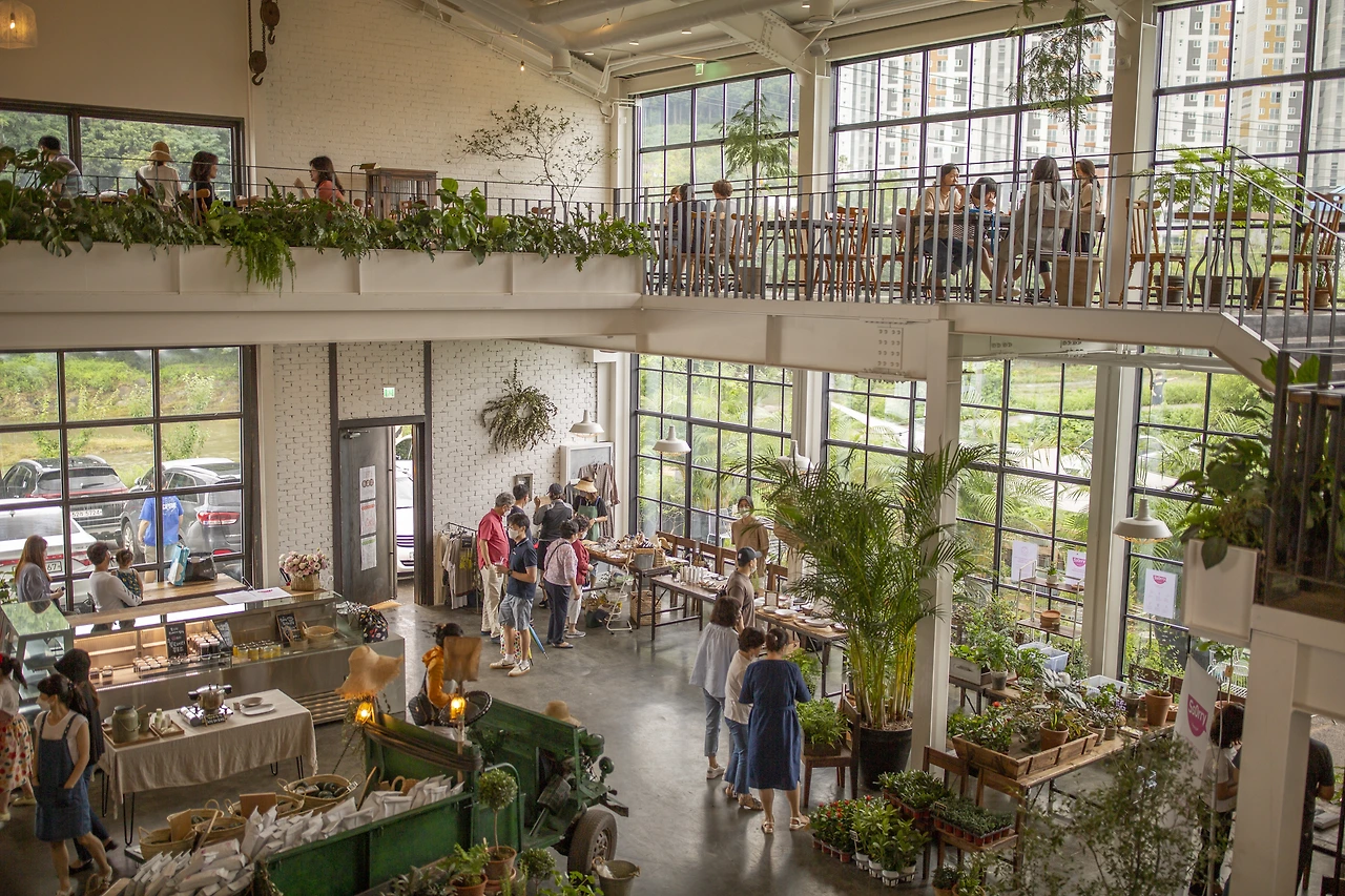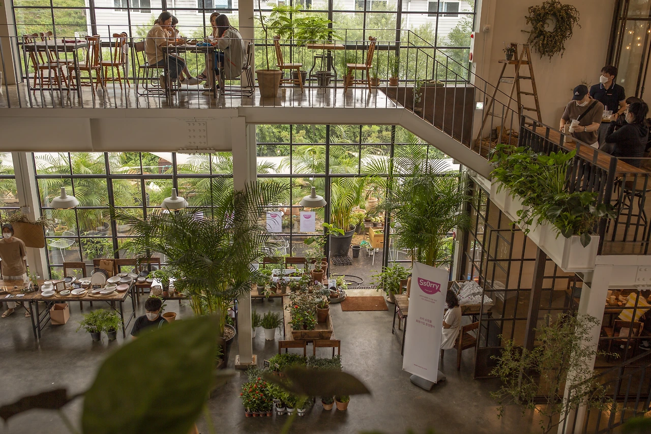 2층 카페석에는 다양한 포토존이 마련되어 있었다. 어디에 앉아도 멋지게 사진을 찍을 수 있는 공간. 오래된 창고를 개조해 억지로 꾸민듯한 느낌 없이 자연스럽고 편안한. 그리고 감각적인 생활용품과 옷을 판매하고 있는 #모니카팜 도 입점해 있었다. 이곳하고 참 잘 어울리는 팝업스토어.