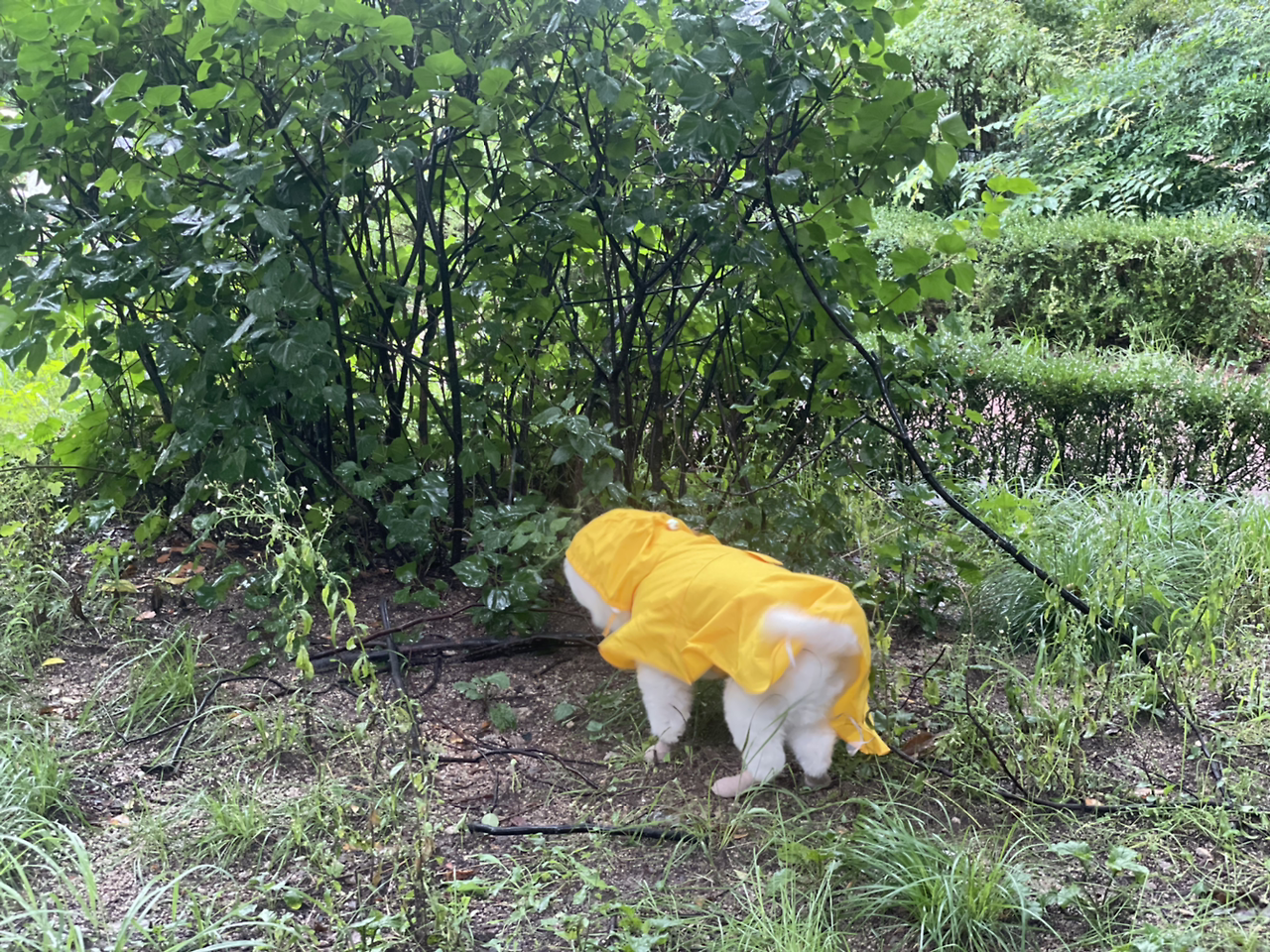 비가 오지 않는 날은 이런 푸디의 행동에 문제 될 것은 없다. 그런데 비가 오는 날이면, 이야기가 달라진다. 푸디는 물을 싫어한다. 그래서 비 오는 날에는 걷지 않는다. 원래도 잘 걷지 않는 아이지만, 비가 오면 그대로 멈춤이다. 그래도 실외 배변을 해야 하는 의무가 있는 집사는 푸디에게 우비를 입히고 밖으로 나갈 채비를 한다. 한 손에는 자동으로 펼칠 수 있는 장우산 들고. 푸디가 움직이지 않으니 한 팔은 푸디를 안고, 한 팔은 우산을 들고(내 팔뚝이 굵어진 이유가 이것 때문 일까). 집 앞 공원 숲길로 향한다. 11kg이 넘는 푸디를 안고. 팔이 부서질 것도 같지만, 나무가 우거진, 풀이 많은 공원은 푸디의 최애 배변 장소다.