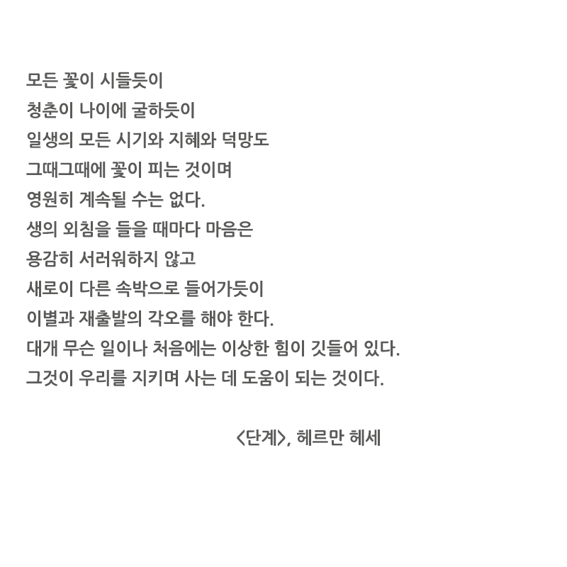 헤세의 글 중 좋아하는 시다. 생의 외침을 들을 때마다, 용감히 서러워하지 않고 이별과 재출발의 각오를 해야 한다. 지나간 일들에 연연하지 않고 새로운 시작을 다짐하는 것처럼. 언제나 바라던 바람은 곁에 멘토 같은 누군가가 있기를 원했지만, 현실과 이상은 너무 멀리 떨어져 사람과 사람이 만나는 것에 순수하지 않은 목적이 자꾸만 숨겨져 있었다. 불행히도 아버지와 같은 마음으로 대해주는 사람은 없다. 이것은 관계의 법칙이었다(천명관의 '고래' 문체를 흉내 내봄).