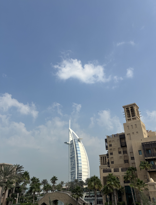 신랑은 회사분들 드릴 초콜릿을 샀는데 전통시장인 줄 알았다면 나도 신랑도 더 많이 구입했을 거다. 간단한 구경을 끝으로 우리는 도심으로 넘어간다. 차를 타고 보는 풍경은 진짜 웅장 그 자체였다. 높고 높은 건물들이 끊임없이 늘어서 있고 건물 유리에 반사되는 빛이 어찌나 눈부시던지. 사막의 나라다 보니 모래 바람이 많이 불어서 건물을 유리로 많이 짓는다고 한다. 부르즈 할리파도 지나가고 주메이라 해변에 가서 버즈 알 아랍도 구경했다.