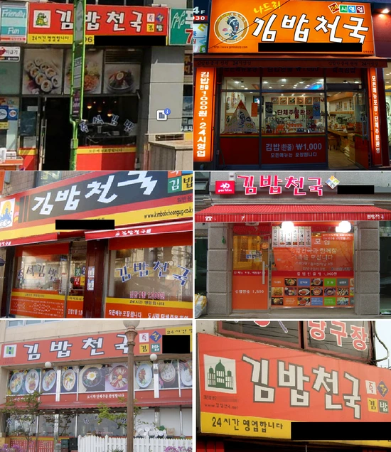 1995년 김밥천국은 '싸고 맛있는 김밥집'으로 소문나면서 급격한 성장을 하게되었다. 김밥나라 등의 유사 브랜드도 이 때 탄생했다. 하지만 창업자는 1998년 김밥천국 상표권을 신청했지만 '식별성이 없다'는 이유로 거절당했다. 당시 가맹점은 100개에 달했다. 하지만 그것이 정점이었다. 상표권이 없다는 틈새를 비집고 들어온 또 다른 '김밥천국'이 난립했다. 또한 유사 점포의 음식 질이 나쁘면 소비자들이 오히려 원조 김밥천국에 전화를 걸어 클레임을 거는 상황이 발생했다. 밑에 그림처럼 정말로 수많은 김밥천국 브랜드들이 난립했다. 우리가 김밥 프랜차이즈의 대표로 김밥천국을 뽑는건 아마도 이런 유사업체의 난립에서 찾을 수 있다.