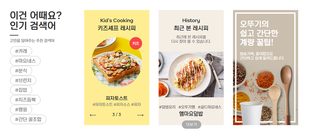꼼꼼히 웹사이트를 살펴 보면 해시태그를 통해 간단하게 테마와 재료 별로 검색어를 구현해논 부분도 구성상 좋았고, 미래 소비층을 타깃을 위한 아이를 위한 레시피, 그리고 집에서 간단하게 계량을 할 수 있는 꿀팁를 마련한 부분도 상당히 구성을 잘한 기획이라는 생각이 들었다. 계속적으로 어려져가고, 아무래도 요리를 처음으로 시작하는 때가 결혼하고 아이를 낳을 때부터라는 점에서 전략적인 부분이 돋보이는 웹사이트 구성이 아닐까 싶다.