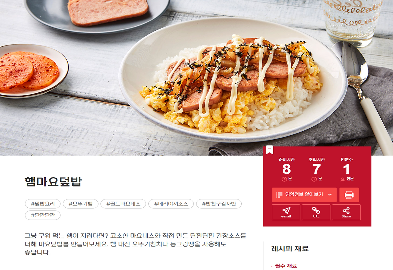 하나의 예시로 햄마요덮밥의 경우에도 굉장히 쉬운 레시피임에도 일단 사진의 퀄리티가 높았다. 또한 준비시간, 조리시간, 인분수가 명확하게 가독성이 높게 표시되어 있다는 점에서 디지털 친화적인 기획이라는 생각이 들었고, 오른쪽 중간에 위치한 URL과 공유할 수 있는 부분을 적절하게 배치하여 바이럴을 고려한 장치를 만든 부분이 똑똑한 구성을 한 부분이라는 생각이들었다.