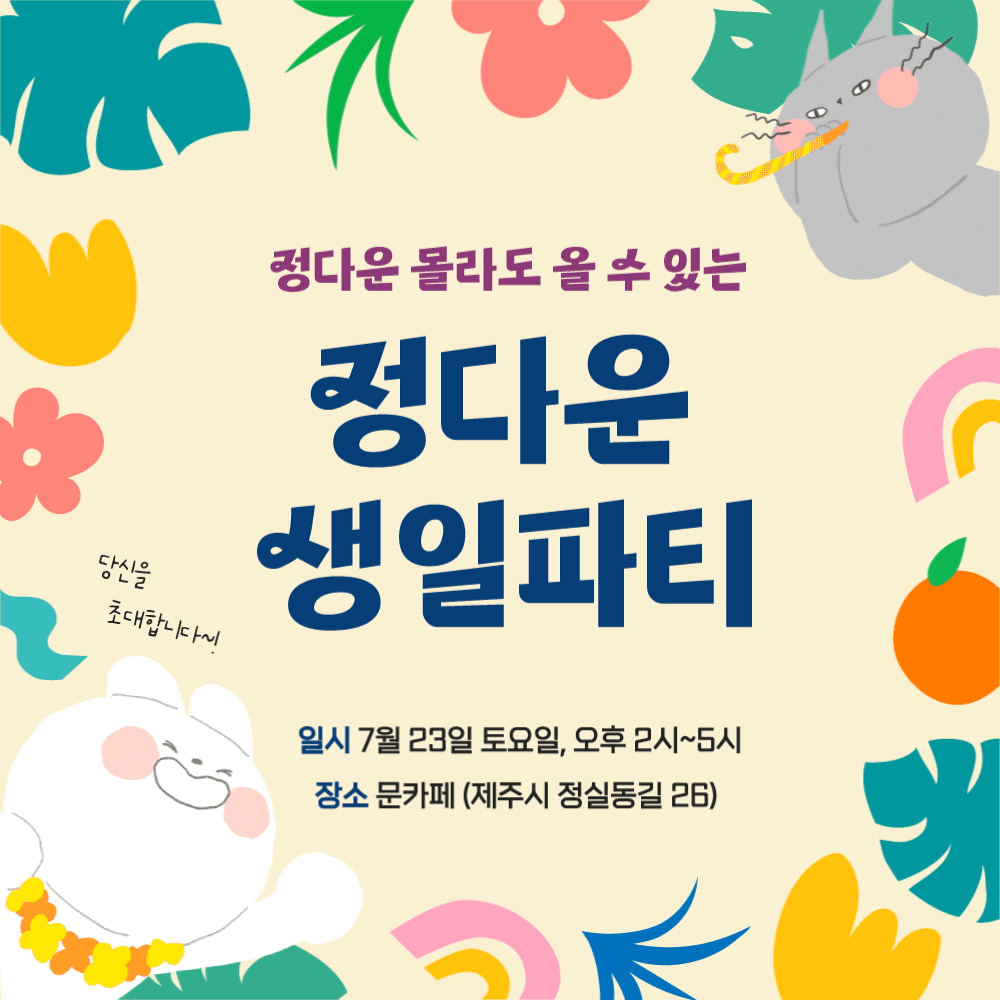 이 글을 보신 여러분, 초대장을 어디선가 보신 모든 분들을 모두 초대합니다. 정다운을 몰라도, 다 참여하실 수 있는 생일파티! 만약 참여는 하시기 어렵더라도 파티를 응원해주고 싶으시다면 선물 대신 가볍게 펀딩도 부탁드릴게요. 노션 페이지에 댓글도 많이 남겨주세요(제발). 그럼 우리 토요일, 정다운 생일파티에서 만나요!
