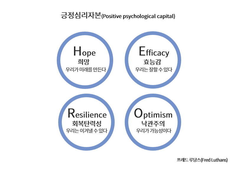 블룸컴퍼니의 팀 활성화 과정인 히어로 과정은 팀원들 간의 대화와 활동을 통해 구성원의 긍정심리자본을 향상하는 것을 목적으로 만들어졌습니다. 긍정심리자본이란, 미국 네브래스카 경영대학의 프레드 루당스(Fred Luthans)교수가 제시한 개념으로, 희망(Hope), 효능감(Efficacy), 회복탄력성(Resilience), 낙관주의(Optimism)로 구성되어 있습니다. 긍정심리자본은 기업의 재무자본, 인적자본처럼 구성원들의 긍정적인 심리 상태가 조직의 성장을 위한 자본의 역할을 할 수 있다는 개념입니다.