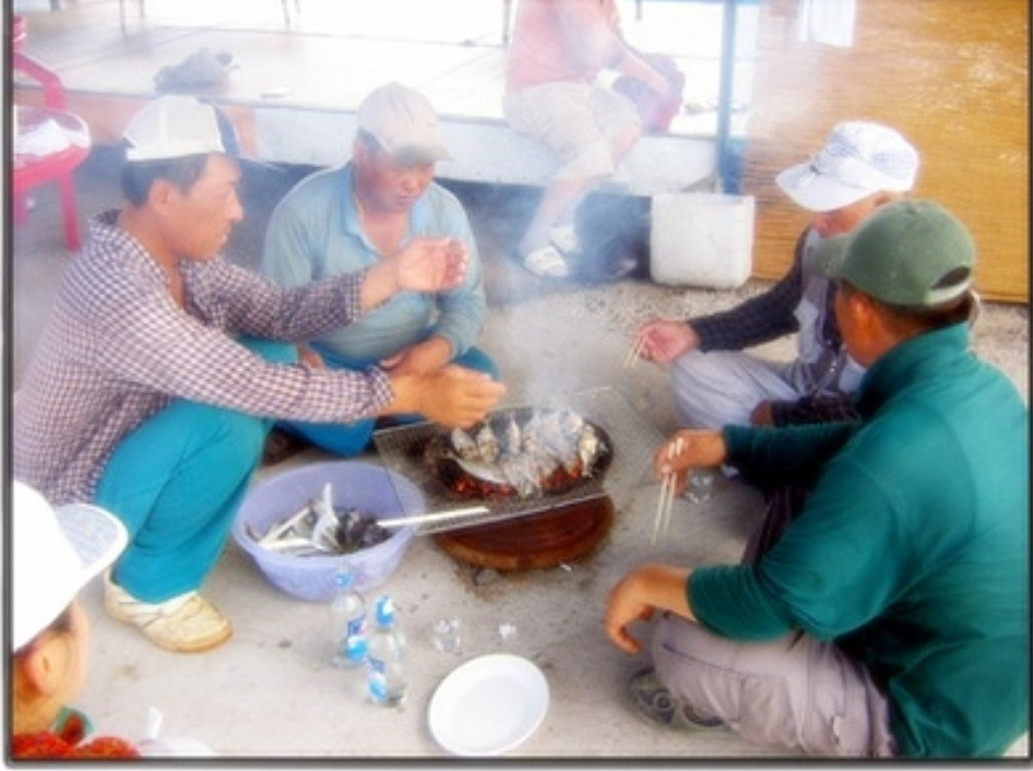 이름 모를 물고기들이 화롯불에 굽히는 동안, 육지로 시집보낸 딸 이야기며, 친척들 이야기로 연기 속 화로 앞으로 자연스레 우리를 끌어당겨주시던 어부 아저씨들. 이야기를 듣고 있는 내내 구운 물고기를 자꾸만 우리 그릇에 담아주셨다. 우리에게 물고기를 많이 먹여 주시고 싶으신 듯 그들의 이야기는 쉬이 끝나지 않았다.