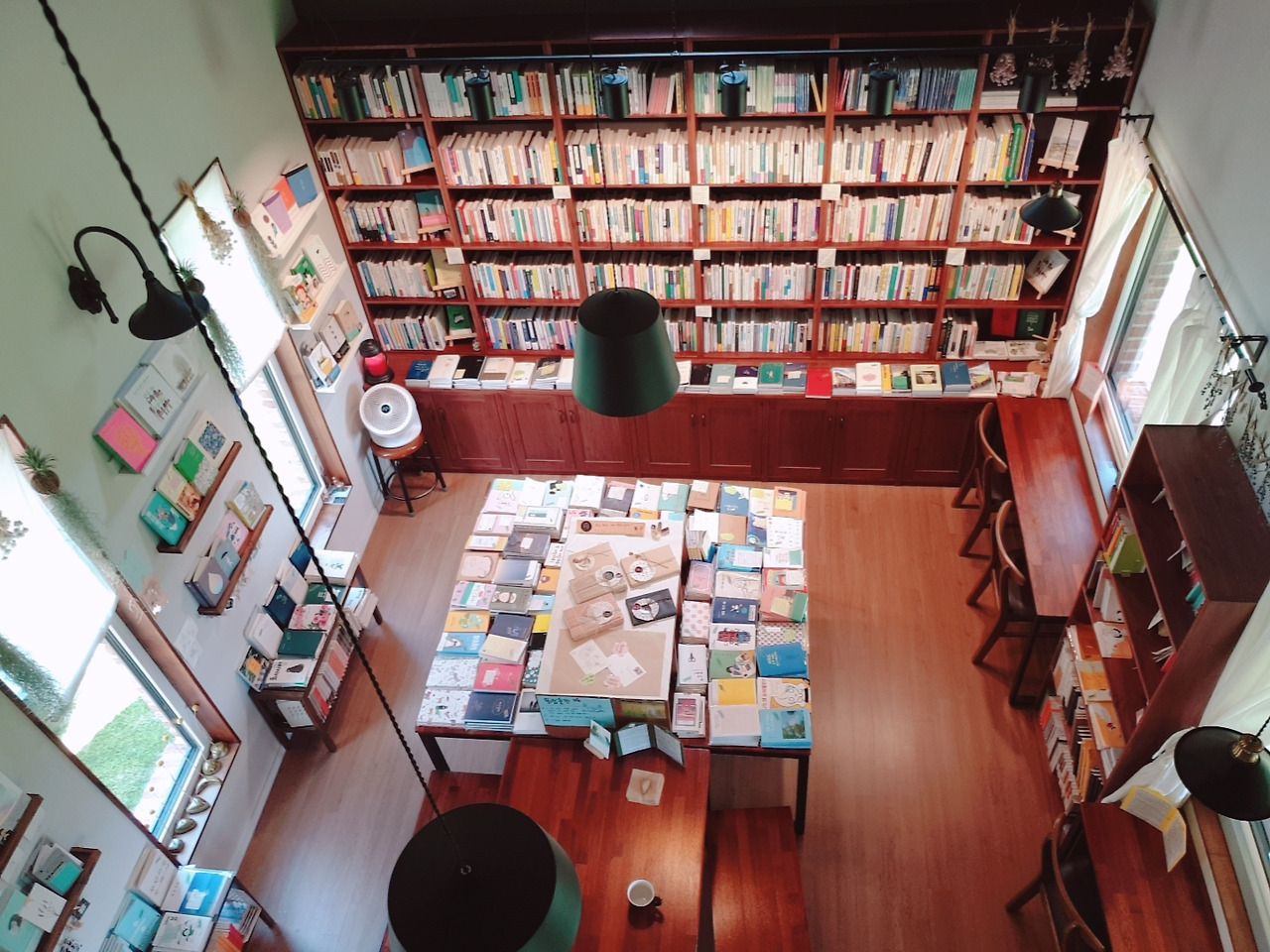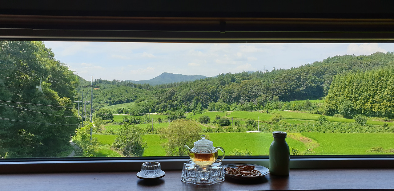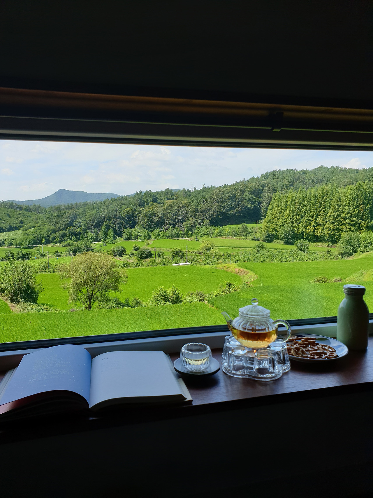 마당으로 들어가니 채송화, 백일홍, 그리고 이름 모를 꽃들까지 예쁘게 가꿔 놓으셨다. 조심스레 문을 열고 들어가니 사장님만 계시고 아무도 없다. 1층엔 서점과 차 마시는 공간이 있고 2층 다락방엔 책 읽을 수 있는 공간이 있다. 1층에 사장님과 둘이 있기가 민망하기도 하고 다락방이 주는 낭만과 창밖으로 보이는 풍경에 이끌려 다락으로 올라갔다. 장미차를 시키고 책장에서 글보다 그림이 많아 보이는 책을 한 권 골라 창가에 앉았다. 찻잔이 작아서 소주잔 같다. 홀짝홀짝 소주를 마시듯 차를 마시니 술을 마시는 기분이다. 책을 읽으려는데 자꾸 눈이 밖으로 향한다. 좁다랗고 긴 창밖으로 보이는 건 오로지 바람에 일렁이는 초록빛 벼와 나무들 뿐이다.