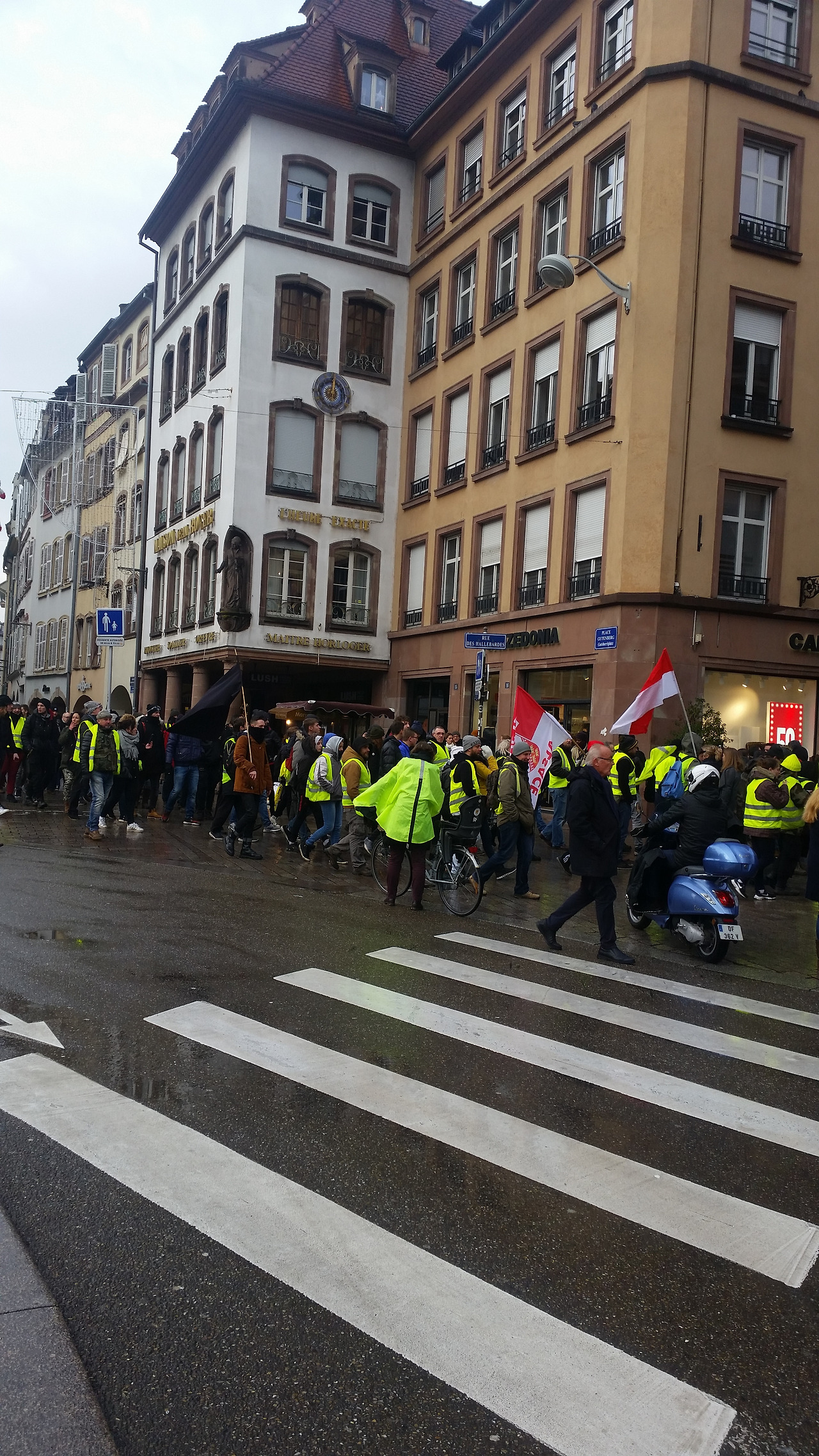 짐만 방에다 두고 쁘띠프랑스 쪽으로 걸어가려고 호텔 앞으로 나왔는데 분위기가 심상치 않다. 역 앞부터 시작해서 골목 앞을 경찰차와 무장경찰들이 막고 서 있다. 경찰들은 검은 방탄복에 총을 들고 완전무장을 하고 있었는데 가까이에서 보니 다들 체격들도 좋고 영화 속 어벤저스처럼 엄청난 포스가 느껴져 멋있어 보이기까지 했다. 골목마다 경찰들이 서 있긴 한데 사람들의 통행을 막고 있지는 않아서 골목 안으로 들어가니 노란 조끼 시위대의 행렬이 보인다. 큰 소리로 구호를 외치고 노래를 부르기도 하며 행진하고 있었는데 자세히 보니 할아버지, 할머니, 아줌마, 아저씨, 학생들까지 평범한 동네 사람들 같았다. 심지어 일부 사람들은 샌드위치를 먹으며 행진을 하고 친구들끼리 깔깔거리며 담소를 나누기도 했다. 그런 모습을 보니 두려운 마음이 사라지고 마치 마을축제 행렬같이 느껴졌다. 그런데 우리가 방심한 순간 앞에서! 펑! 펑! 소리가 크게 들리고 흰 연기가 났다. 최루탄인가? 대학 다닐 때도 맡아보지 못 한 최루탄? 근데 최루탄 특유의 매캐한 냄새가 안 나는 걸 보면 그냥 겁주기용 공포탄인가 싶었다. 하지만 새가슴인 우리는 더 이상 전진하지 못하고 돌아 나왔다.