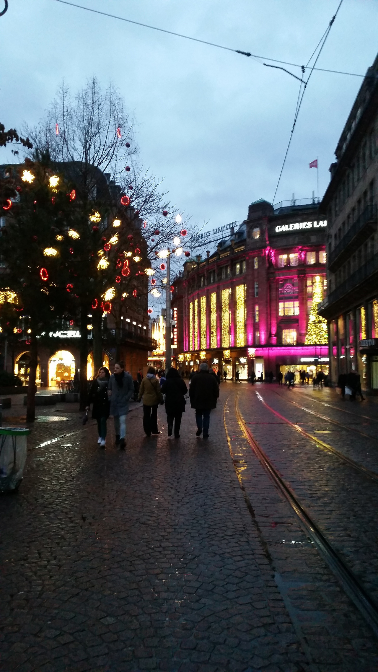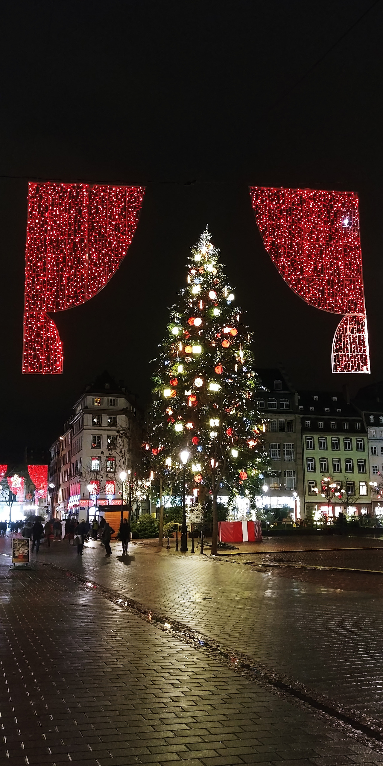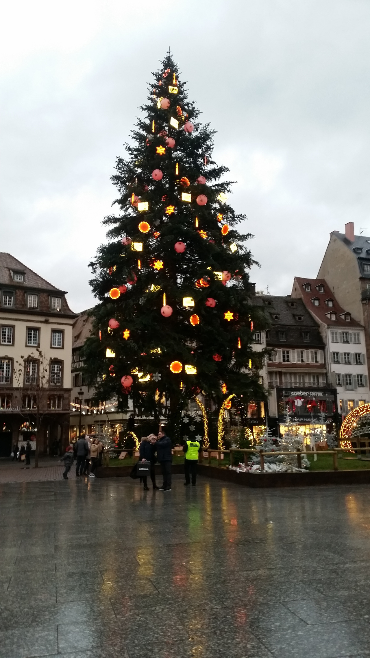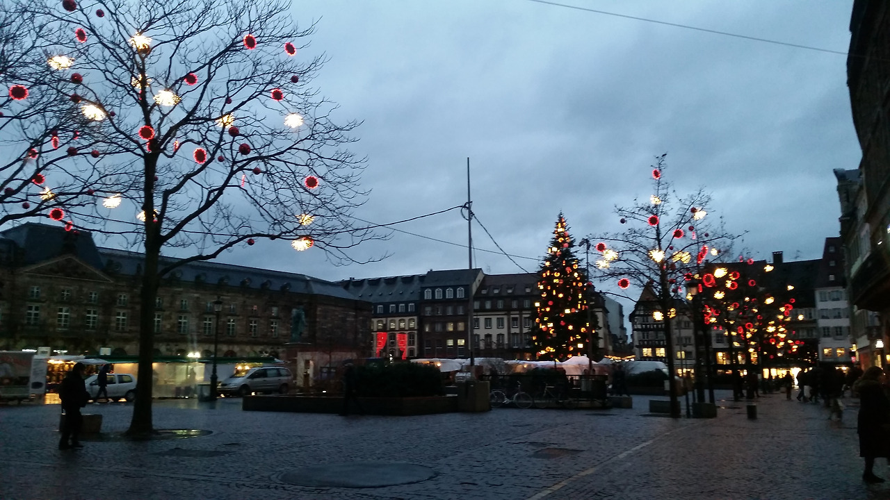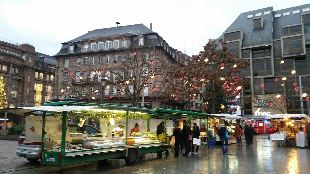 이것만 보고 돌아가기에는 아쉬워서 어제 갔었던 쁘띠 프랑스를 다시 돌아보고 선물가게들을 들렀다가 노트르담 성당 뒤편에 있는 번화가로 갔다. 작은 도시라고 생각했는데 쁘띠 프랑스와는 달리 명품거리가 이어지고 라파예트와 쁘렝땅백화점도 있다. 세일을 많이 한다는 말에 두 백화점을 모두 돌아보고 자라와 H&M까지 쇼핑을 했으나 하나도 건지진 못했다. 다리도 아프고 허리도 아프고 더 이상은 안 되겠다 싶은 찰나 KFC가 딱 보인다. 순간 내가 "치킨?~"하자 친구가 "치킨~!" 하고 받아친다. 그래 오늘 저녁은 치킨이다. 핫윙 아홉 조각과 포테이토에 스프라이트를 시켜 먹었는데 역시 치킨은 진리~~~! 우리가 아는 바로 그 맛이다. 나름 배부른 저녁을 먹고 걷다 보니 어마어마한 크리스마스트리가 보인다. 세상에~~~ 너무너무 예쁘다. 내가 태어나서 본 트리 중에 제일 크다. 끊임없이 감탄하며 크리스마스 선물을 받은 아이처럼 가슴이 설렌다. 그런데 이렇게나 아름다운 이 곳이 작년 크리스마스 마켓 총격 테러가 있던 곳이 라니... 아직도 여전히 희생자들을 추모하는 꽃들이 쌓여있는 모습을 보니 마냥 좋아할 수만은 없었다. 어떻게 이런 아름다운 곳에서 총을 쏠 생각을 했는지 무고한 희생자들을 생각하니 마음이 아팠다.