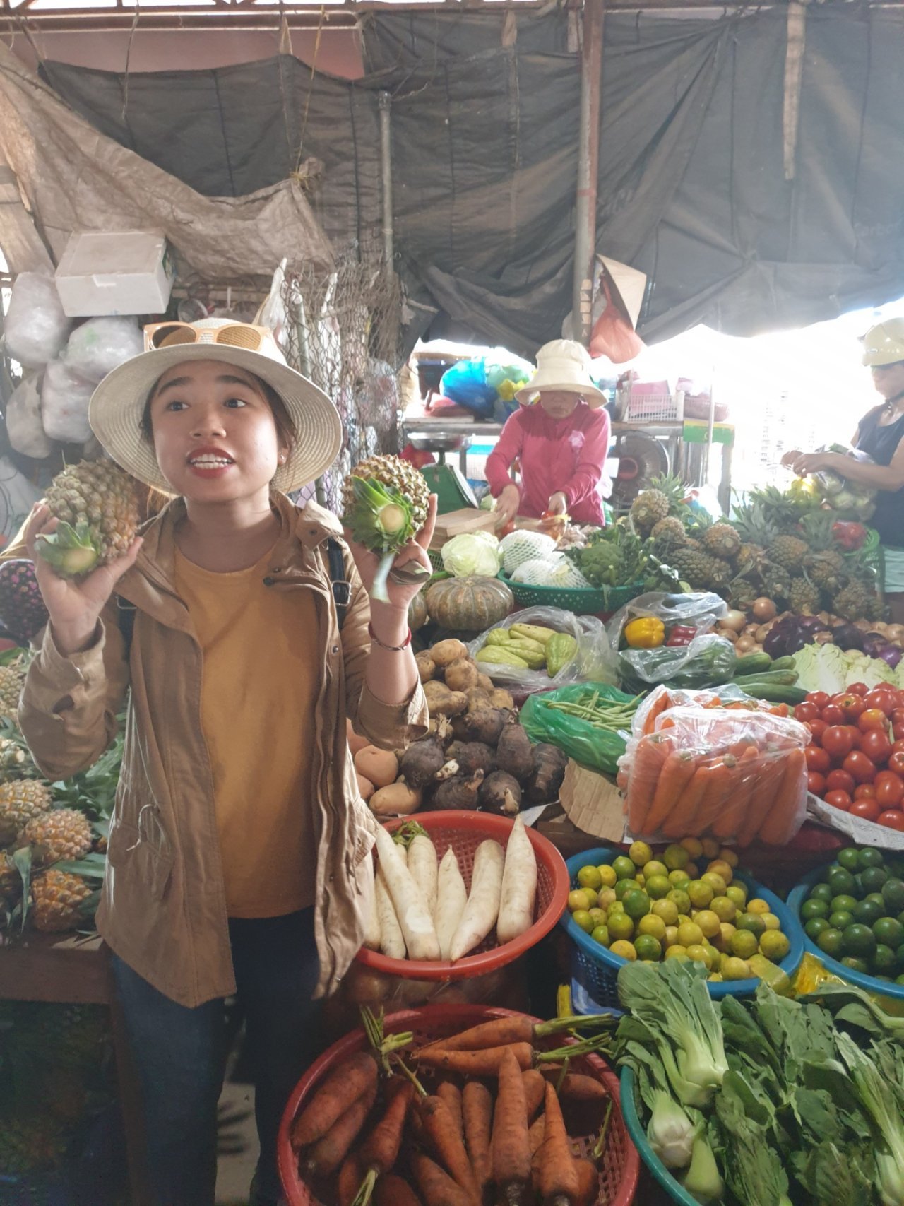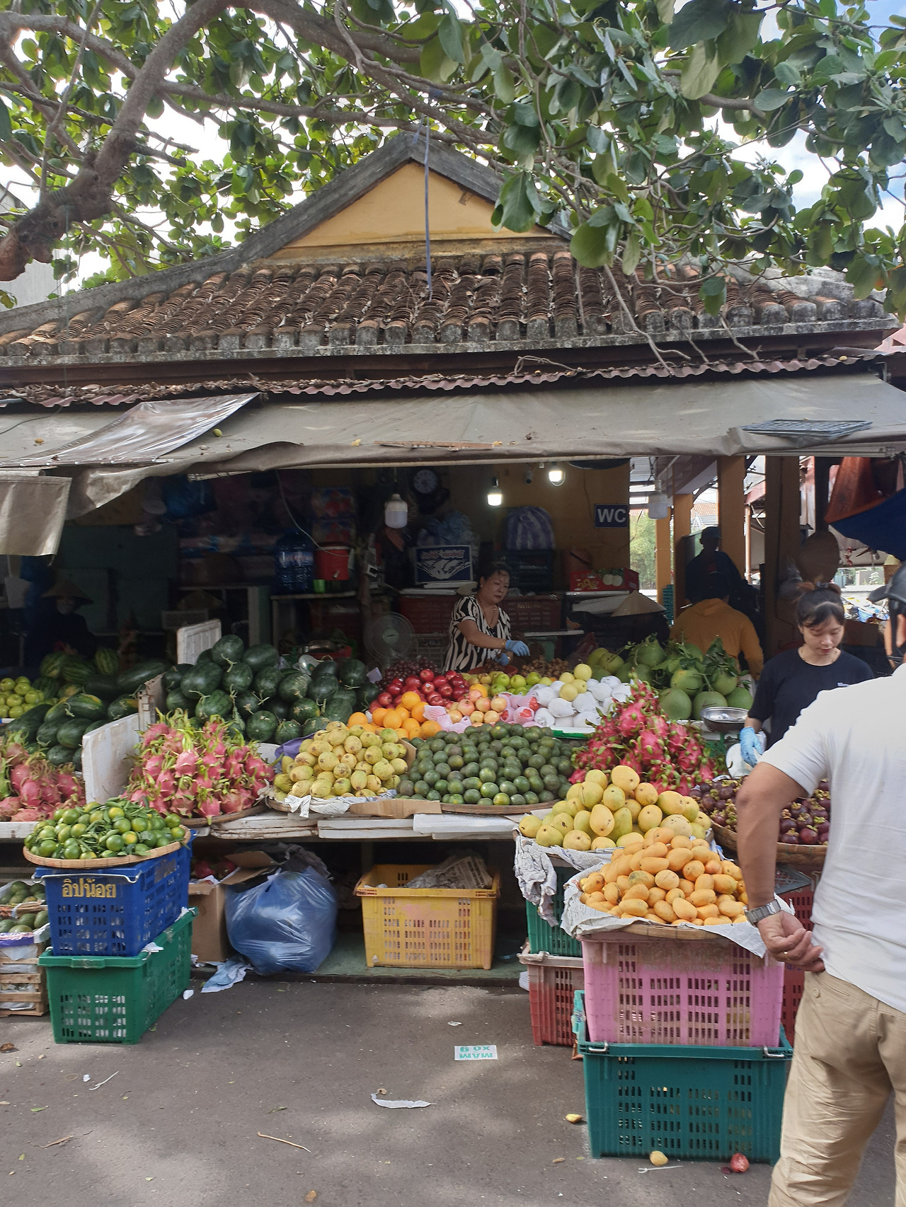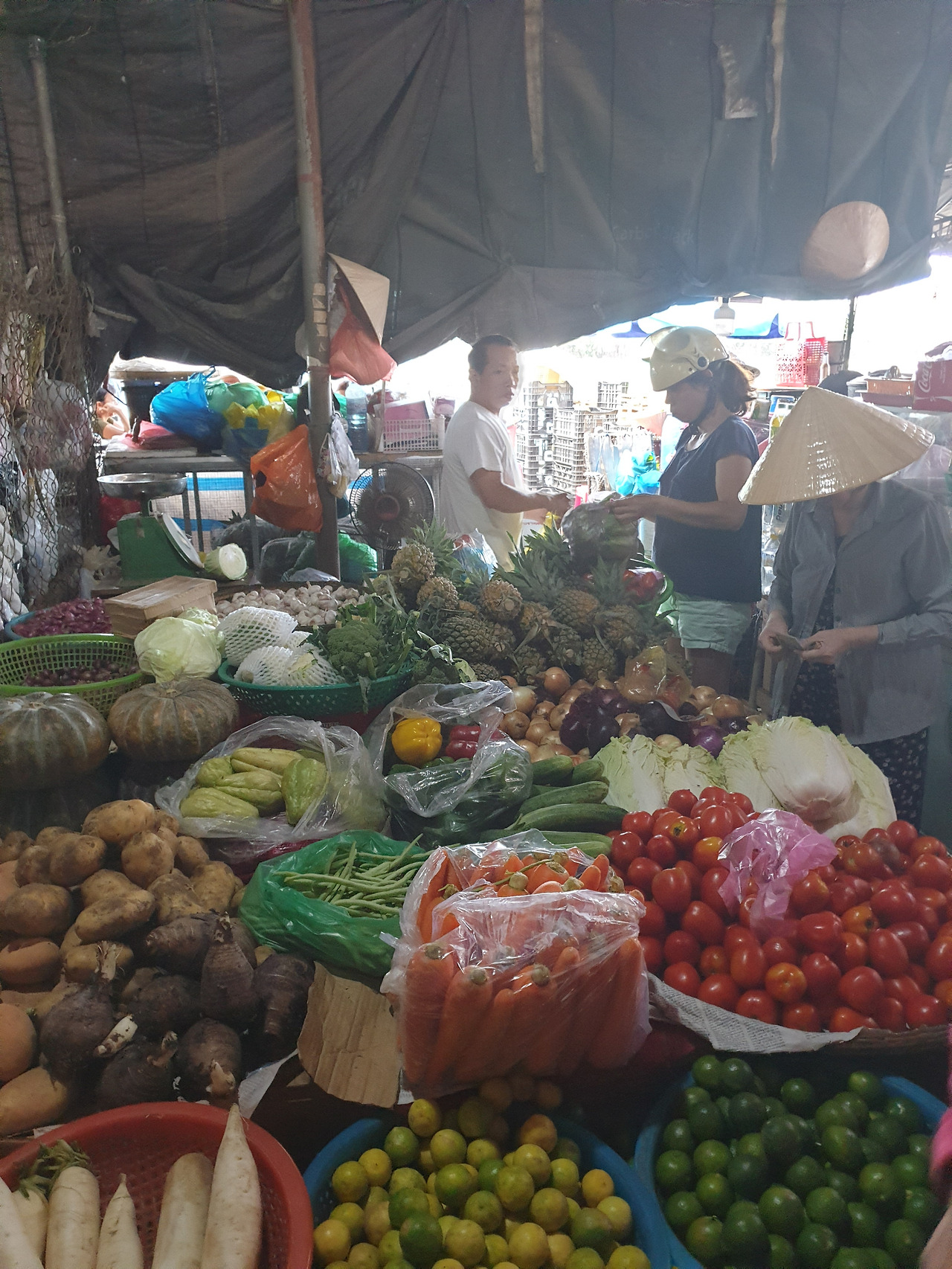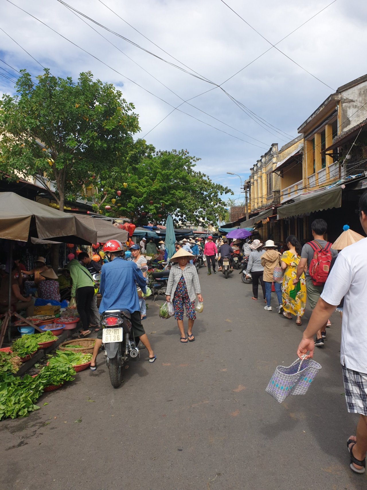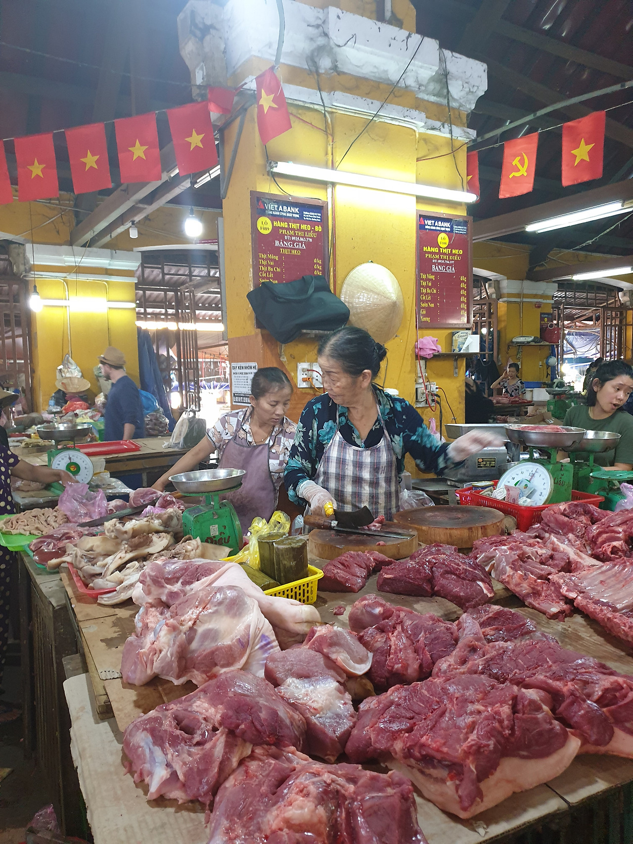 오늘은 바구니 배 타기 체험과 쿠킹 클래스를 신청한 날이라 8시 30분에 호텔로 픽업을 오기로 했다. 프런트에서 전화가 와서 내려가 보니 어라? 이 분은 어제 호텔 체크인해주던 직원분? 어찌 된 거지? 투잡을 뛰시나? 암튼 가이드님을 따라 차를 타고 호이안 시장 앞에 내렸다. 우리 말고도 한국인 가족, 일본인 가족, 한국인 커플 그 외 많은 외국인들이 있었다. 가이드 언니가 모두에게 바구니를 하나씩 들려주고는 장을 봐야 하니 잘 따라오란다. 시장이 엄청 비지하니까 소지품 조심하라는 당부의 말과 함께... 가이드 언니 말대로 시장은 현지인들과 관광객 그리고 오토바이까지 뒤엉켜 정신이 하나도 없었다. 가이드 언니가 오늘 만들 음식의 재료들을 사면서 하나하나 알려주고 각자의 장바구니에 넣어준다. 다른 건 다 괜찮았는데 정육점에서는 날고기 냄새에 비위가 좀 상했다. 붉은 고기들의 비주얼도 보기 힘들었지만 날것 그대로의 비릿한 냄새는 견디기 힘들었다. 얼음도 냉장고도 없으니 당일 도축, 당일 판매가 원칙이고 저녁때가 되면 고깃값이 싸진단다. 우린 아침 일찍 왔으니 그나마 싱싱한 것일 텐데도 적응이 안 되는 냄새였다.