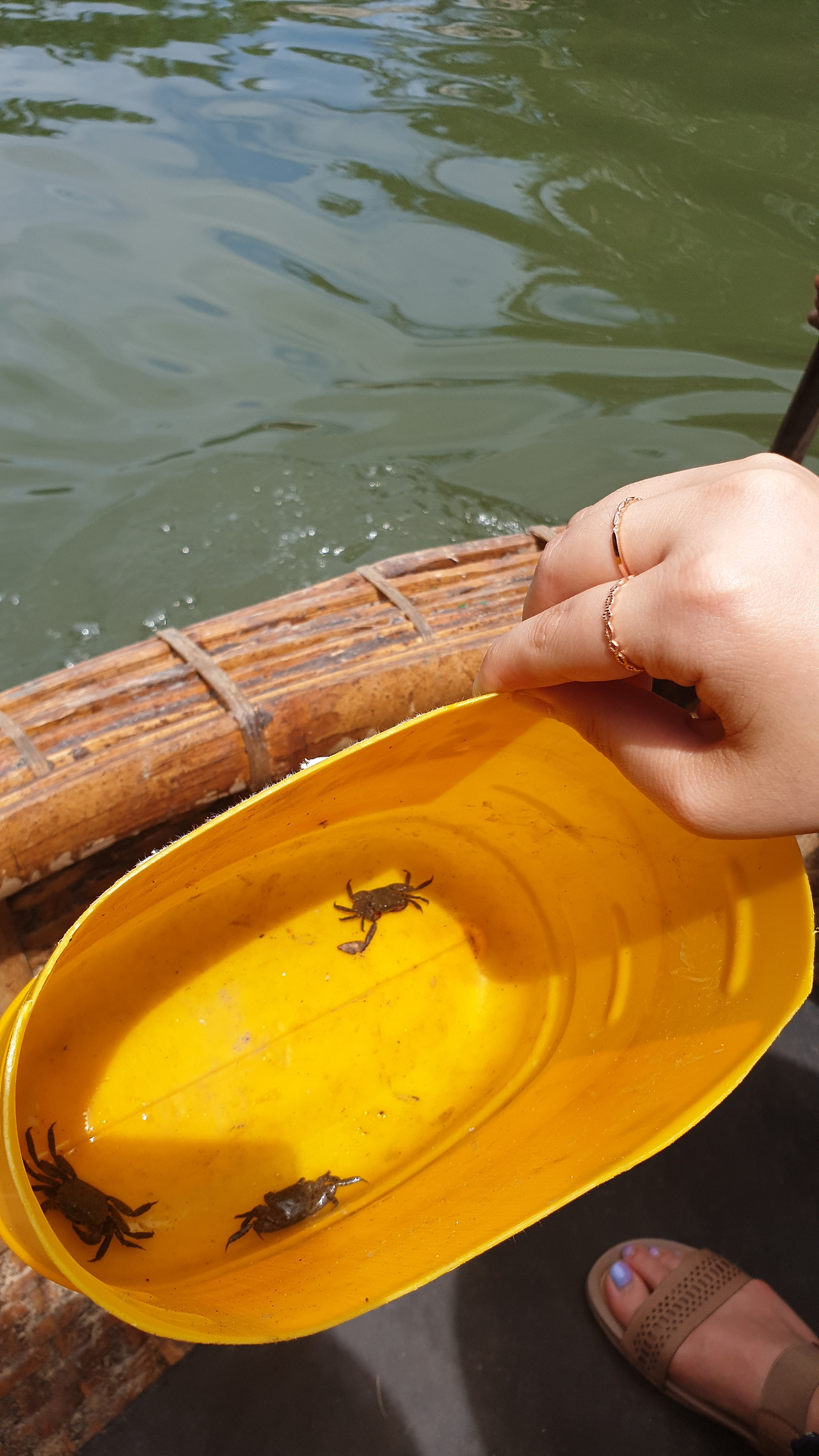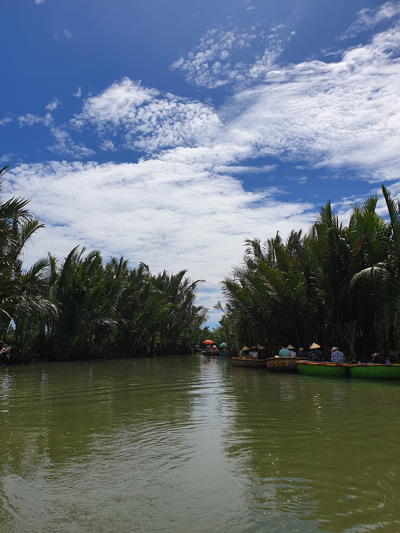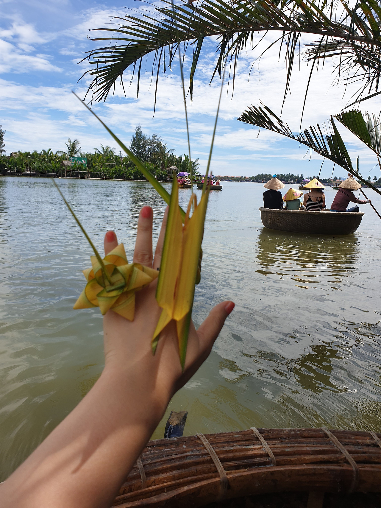 정신없이 시장을 보고 통통배 같은 배를 타고 40여분을 달려 코코넛 빌리지에 도착했다. 배가 거의 도착할 때쯤 우리 배 주변으로 바구니 배들이 다가온다. 배에서 배로 옮겨 타는 거였다. 가이드 언니 손을 잡고 코코넛 배에 옮겨 타니 아주머니께서 베트남 전통 모자 농을 건네주시고, 야자수 잎으로 만든 반지랑 메뚜기를 손에 끼워주신다. 작은 코코넛 크랩 잡기 체험도 했는데 애들이 그동안 너무 많이 속아서 그런지 통 나오질 않아 아주머니께서 잠시 당황하셨지만 포인트를 바꿔서 결국 잡게 해 주셨다.