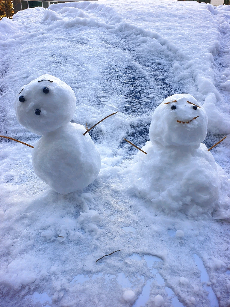 그렇게 집콕에 지쳐갈 즈음. 베란다에서 내다보니 추운 날씨가 조금 누그러드는듯 싶고, 햇빛도 살살 나는 게, 더 이상 길도 미끄러워 보이지 않았다. 그래! 눈 보러 나가자~! 눈이 쌓인 김에 오랜만에 어그부츠까지 신었다. 내 차도 눈이 소복이 쌓였네. 차가 밤새 꽁꽁 얼어있었을 생각을 하니 미안한 마음이 들어 짠했는데 누군가 옆 차 위에 만들어 놓은 귀여운 눈사람에 잠시 마음이 사르르 녹는다.