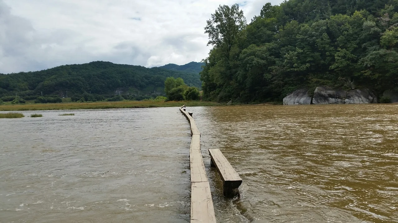 밤새 빗소리가 들려 아침까지 비가 오면 어쩌나 걱정했는데 일어나 보니 비가 그쳐있었다. 우리가 이번에 날씨 복은 있나 보다. 밤새 물이 얼마나 불었나 궁금해서 아침을 먹자마자 물가로 가봤다. 물이 많이 붇긴 했지만 생각만큼 무섭진 않았다. 물론 물살이 더 세져서 현기증 때문에 다리를 건널 수는 없었다.