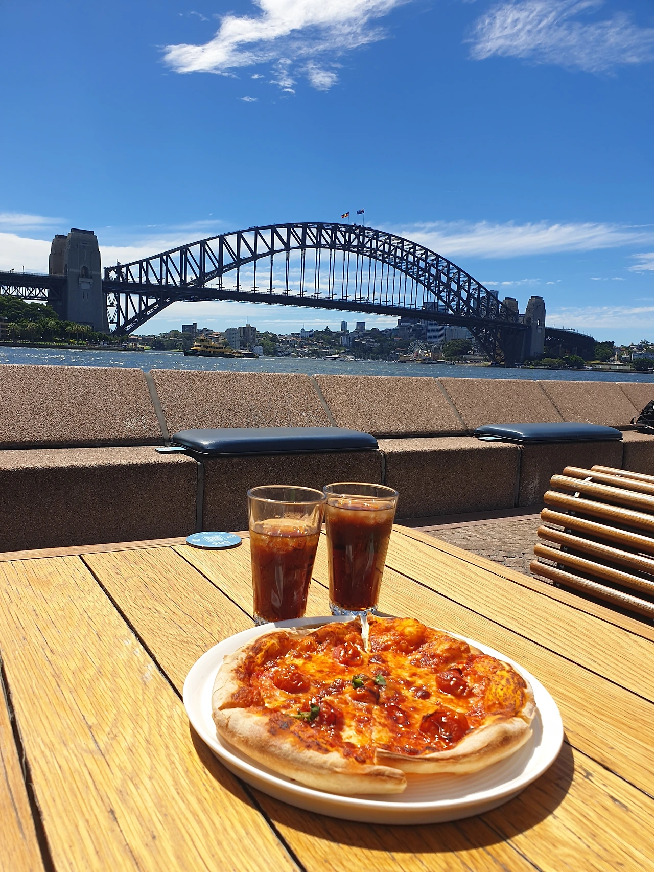 그리고 이곳에서의 온 또 한 가지 이유인 오페라바! 오페라 하우스 아래쪽으로 쭉 이어지는 오페라바는 한낮의 뜨거운 태양에도 아랑곳하지 않고 사람들이 많았다. 간단하게 피자와 콜라를 주문했다. 가격은 예상대로 사악했지만 이곳에서 마주하는 오페라하우스와 하버브릿지는 나를 들뜨게 하기엔 하기엔 충분했다. 점심값에 이 아름다운 풍경값이 포함된 거라면 충분히 지불할 마음이 있다. 블로그에서 봤던 대로 갈매기들이 호시탐탐 사람들의 음식을 노렸으나 다행히 우리 피자에는 관심이 없었다.