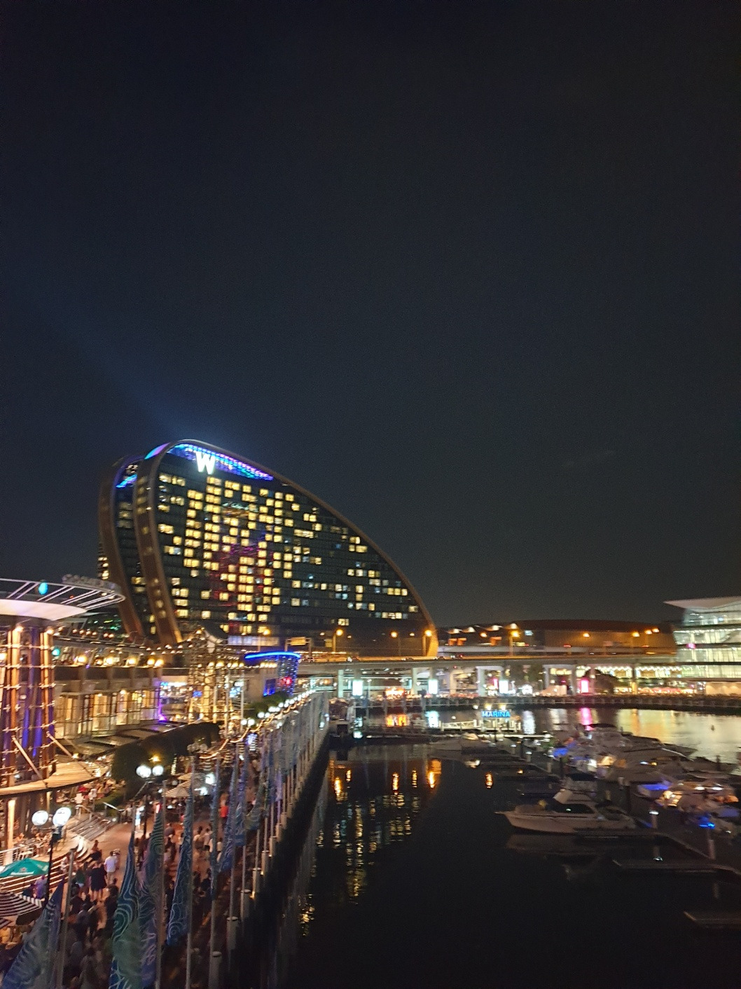 달링하버에 도착해 어두워지기 시작하자 달링하버에 쭉 늘어선 레스토랑과 바는 흥겨운 분위기로 가득했다. 거리엔 어깨를 드러낸 채 드레스업한 사람들이 넘쳐났고, 토요일밤이라 그런지 다들 한껏 들떠있는 느낌이었다. 저녁을 먹으러 가긴 해야겠는데 우리만 너무 캐주얼한 복장이라 들어가는 것이 어딘가 어색했다. 골드코스트 이후로 또다시 너무 많이 입어서 부끄러워지는 순간이었다. 어쩔 수 없이 우리 복장에 맞게 맥도날드를 찾아가서 햄버거를 먹었다.