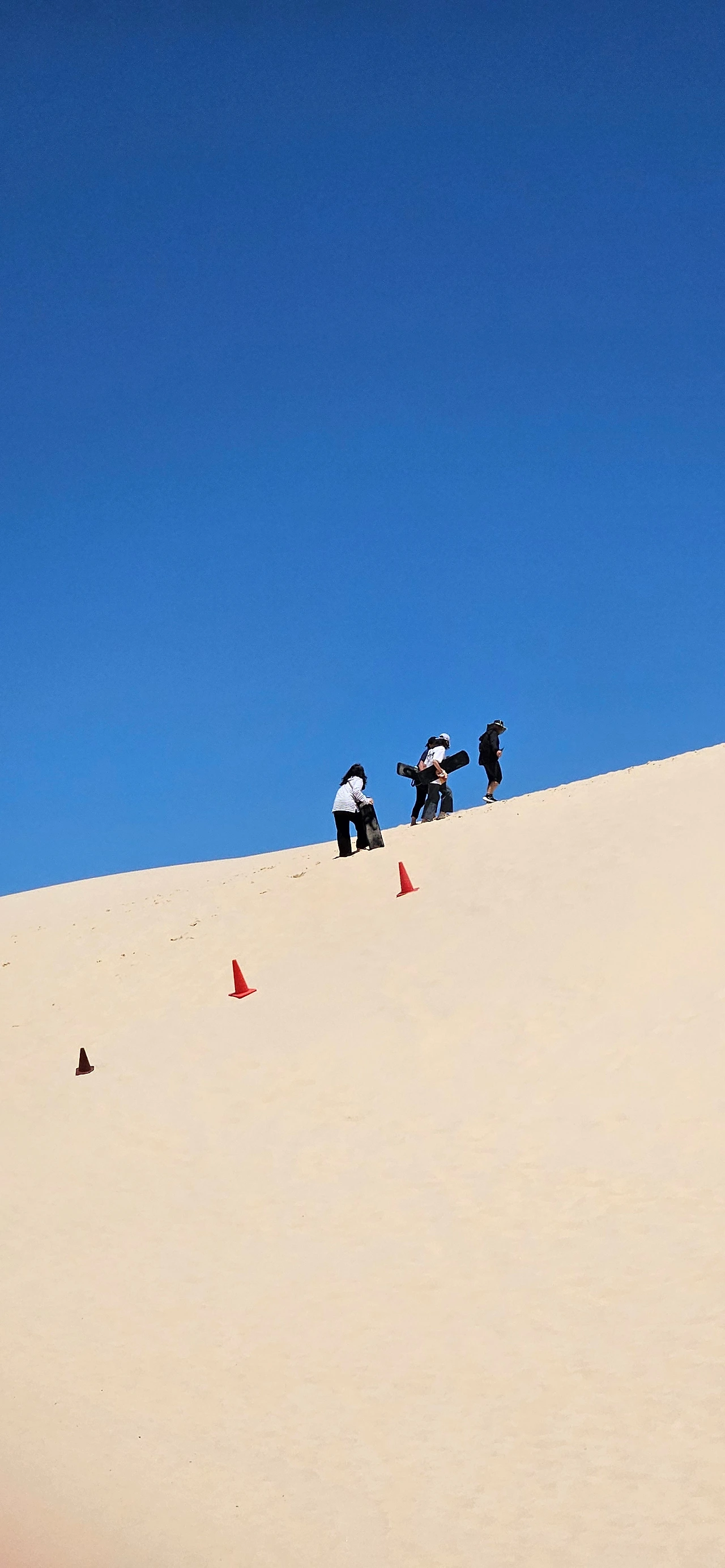 다음은 샌드보드 타기! 무제한으로 샌드보드를 탈 수 있다는 말에 오늘 투어에서 가장 기대했던 체험이었다. 사실 이곳은 사막은 아니고 해안가의 모래가 바람에 쌓여서 만들어진 일종의 사구라고 한다. 말하자면 태안 신두리 사구의 자이언트 버전인 셈이다. 모래 언덕을 보며 두근거렸던 마음은, 뜨거운 모래를 밟자마자 살짝 후회로 바뀌었다. "모래가 이렇게 뜨거울 줄이야..." 발바닥이 달아오를 정도로 뜨거운 모래 위를 커다란 보드를 들고 올라가느라 타기도 전에 체력은 이미 방전 상태. 여러 번 탈거라고 마음먹었으나 두 번 타고나니 온몸이 기진맥진이었고, 속도도 별로 나지 않아 스릴도 재미도 없었다. 결국 두 번 타는 것으로 끝!
