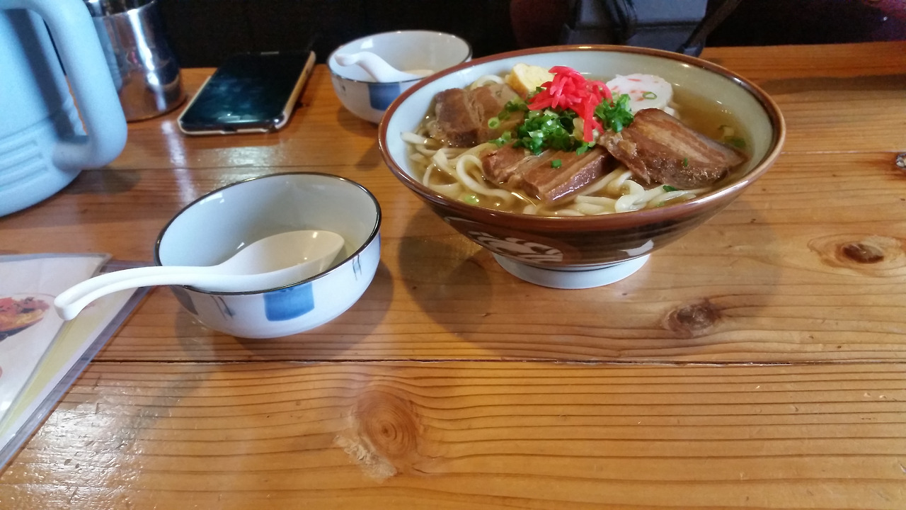 정신없이 다니다 보니 점심때가 지났다. 급격한 허기에 식당을 찾기 위해 와이파이를 찾아 헤매다 츄라우미수족관에서 3분 거리에 있는 식당을 찾았다. 이름도 생소한 삼겹살소바와 타코라이스를 시켰는데 시장이 반찬인지 몰라도 허겁지겁 맛있게 먹었다. 그리고 이때까지만 해도 우린 알지 못했다. 우리가 소바란 단어만 들어도 질려할 줄은...