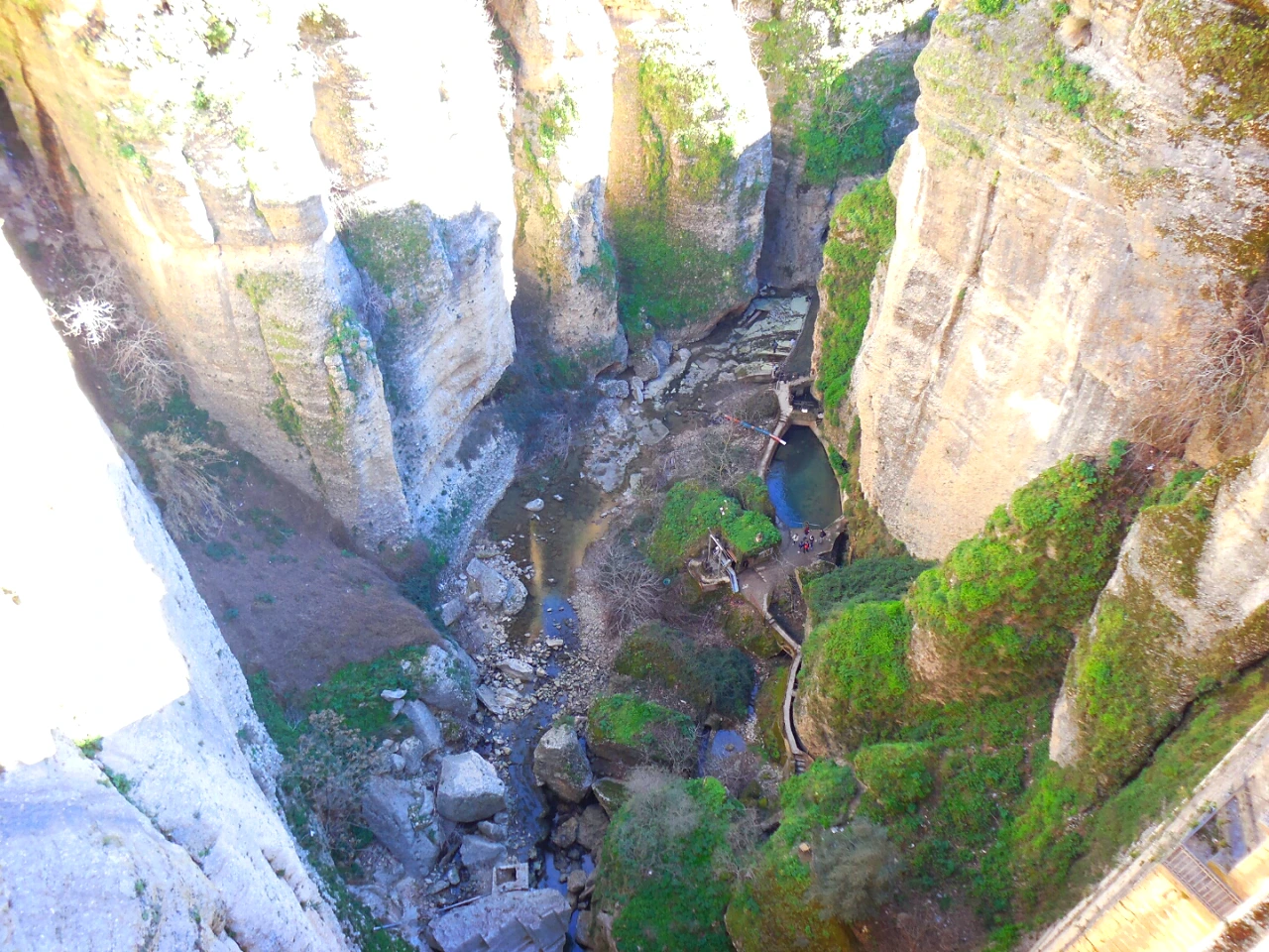 안도의 한숨을 내쉬며 론다 터미널에 도착하니 생각보다 관광객들이 꽤 많다. 어디로 가야할지 고민하지 않아도 사람들의 행렬을 따라가다 보니 누에보 다리에 도착했다. 와~~~~!!! 역시 가까이 보니 정말 굉장하다. 아래쪽을 제대로 쳐다볼 수 없을 만큼 아찔한 높이다. 어떻게 이런 곳에 다리를 놓고 마을을 이루고 살았을까? 무섭지만 다리 아래 협곡으로 내려가 보기로 한다. 고소공포증이 있는 나로선 생명의 위협(?)을 느낄만한 구간도 있었지만 내려가 보니 비로소 다리의 진짜 모습이 보인다. 올려다 볼수록 정말 대단하다.